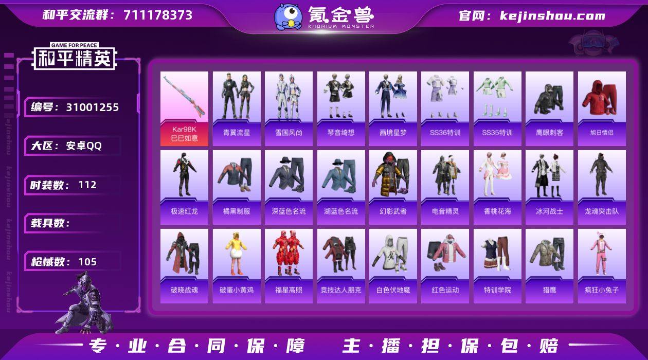 素材号 浪漫天命 奇异狩猎者 红眼罩 保时捷梦幻青 3满级特效枪 3枪1载具 暗影哥特 暗夜魅影 萌趣颜团子 瑞龙福将 醒狮腾龙 异彩先驱 焰山流火 虚音幻奏 满级AKM-梦之光华 满级DP-28-豹影疾电 满级Kar98K-巳巳如意 王牌印记6 热力值37666 K30603 和平精英买号包赔带二次营地ID:786105407