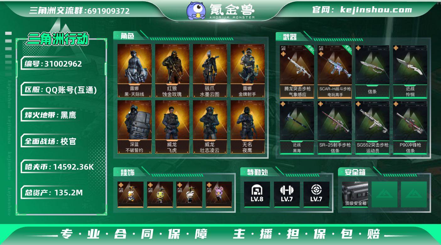 实名:不可二次实名 总资产:135.2M 哈夫币:14592.36K S7顶级安全箱(3x3) 烽火地带段位:黑鹰 烽火地带等级:60 全面战场段位:校官 全面战场等级:50 8级仓库,7级训练中心,7级靶场,2级潜水中心,1级收藏室