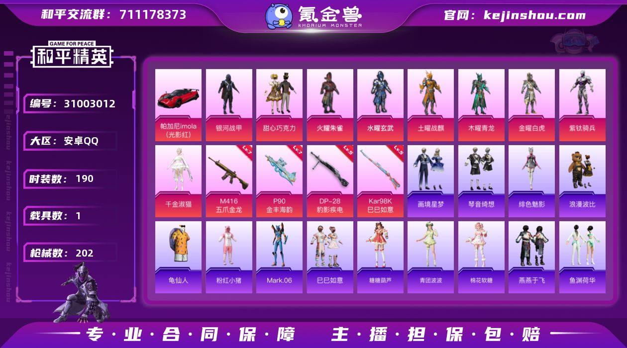 安卓 手Q-9粉装-4特效枪-1载具-3粉色飞行器-70679热力值-6王牌印记-190套装-202枪皮【热门品类】:套装-龟仙人,套装-浪漫波比,套装-粉红小猪,角色-Mark.06【粉色套装】:粉装-银河战甲,粉装-甜心巧克力,粉装-火曜朱雀,粉装-水曜玄武,粉装-土曜战麒,粉装-木曜青龙,粉装-金曜白虎,角色-紫钛骑兵,角色-千金淑猫【粉色枪皮等级】:M416-五爪金龙(七级),P90-金丰海韵(七级),Kar98K-巳巳如意(五级),DP-28-豹影疾电(五级)【粉色载具】:帕加尼imola(光影红)【粉色枪皮】:M416-五爪金龙,P90-金丰海韵,Kar98K-巳巳如意,DP-28-豹影疾电【粉色飞行器】:千面幻镜飞行器【粉色降落伞】:极限特训降落伞,银河战甲降落伞,雪国幻梦降落伞,春暖花开降落伞,四圣焕新降落伞,恐龙拽拽降落伞,垂柳戏鸭降落伞,海螺星光降落伞,星梦奇缘降落伞,初号机 觉醒Ver.降落伞,樱桃泡泡降落伞,异瞳寒姬降落伞,炫彩糖果降落伞【稀有套装】:套装-龟仙人,套装-巳巳如意,套装-雪国风尚,套装-炫彩糖果,套装-糖糖葫芦,套装-青团波波,套装-棉花软糖,套装-燕燕于飞,套装-鱼渊荷华,套装-风舞幻音,套装-紫幽梦,套装-蓝冰羽,套装-霓虹热舞,角色-绯色魅影,套装-画境星梦,套装-琴音绮想【稀有枪皮】:AUG-冰晶雪宝,AKM-夜灯,AKM-灼热熔岩,AKM-生命誓言,AKM-破晓战魂,AKM-缤纷海域,AKM-萌趣颜团子,AKM-霓虹街区,AKM-龙的传人,M16A4-幻世战舞者,M16A4-蓝色火焰,SCAR-L-夜灯,SCAR-L-炫彩节奏,SCAR-L-玉兔迎春,SCAR-L-银河战甲,M416-夜灯,M416-糯团青竹,M416-红色方程式,M416-绯红前夜,M416-蓝色火焰,GROZA-恐龙拽拽,GROZA-懵萌河马,GROZA-生命誓言,GROZA-田园牧歌,GROZA-银河战甲,AUG-天降萌叽,AUG-耀粉歌者,QBZ-原初圣火,QBZ-彩虹符号,QBZ-银河战甲,M762-天降萌叽,M762-彩虹符号...