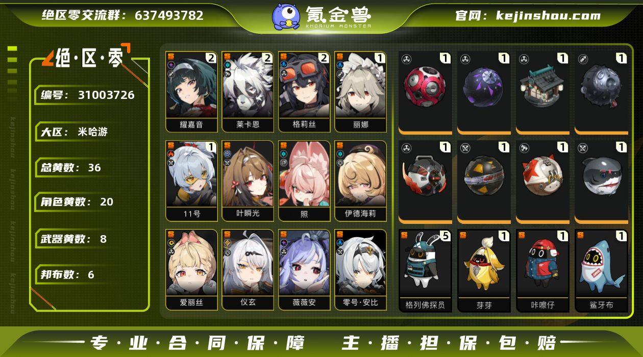 冒险等级:58 总黄数:36 菲林底片数量:290 菲林数量:140 加密母带数量:0 五星角色数:20 2命耀嘉音,2命莱卡恩,2命格莉丝,1命丽娜,1命「11号」,0命叶瞬光,0命照,0命伊德海莉,0命爱丽丝,0命仪玄,0命薇薇安,0命零号·安比,0命伊芙琳,0命浅羽悠真,0命星见雅,0命月城柳,0命朱鸢,0命艾莲,0命猫又,0命珂蕾妲 五星武器数:8 1精十方锻星,1精飞鸟星梦,1精霰落星殿,1精啜泣摇篮,1精嵌合编译器,1精硫磺石,1精燃狱齿轮,1精深海访客 邦布数量:6 5精格列佛探员,1精芽芽,1精咔嚓仔,1精鲨牙布,1精巴特勒,1精插头布 从周一到周五,狡黠甜心,墨形影踪,暖霞拾光,晴澜双迹套装,漪光夜曲 卖家说:基本全角色,强力角色都有,三个虚狩都有且有皮肤,很多任务啊活动啊之类的都没做预计肝,的话还可以拿几万菲林,没时间玩了退了便宜卖看上的可砍价。