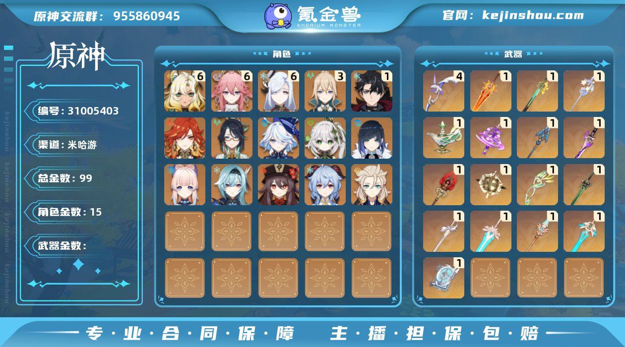 冒险等级:60 总黄数:131 5星角色数:46 5星武器数:27 原石数量:1680 纠缠之源数量:0 6命芙宁娜,6命琴,6命莫娜,4命刻晴,3命迪希雅,3命提纳里,2命希诺宁,2命纳西妲,2命钟离,2命迪卢克,2命七七,1命杜林,1命玛薇卡,1命那维莱特,1命妮露,1命申鹤,1命珊瑚宫心海,1命雷电将军,1命神里绫华,1命甘雨,0命兹白,0命哥伦比娅,0命丝柯克,0命梦见月瑞希,0命茜特菈莉,0命恰斯卡,0命基尼奇,0命阿蕾奇诺,0命闲云,0命娜维娅,0命白术,0命艾尔海森,0命流浪者,0命夜兰,0命神里绫人,0命八重神子,0命魈,0命荒泷一斗,0命宵宫,0命枫原万叶,0命优菈,0命胡桃,0命阿贝多,0命达达利亚,0命可莉,0命温迪 6命班尼特,6命菲米尼,6命嘉明,6命久岐忍,6命琳妮特,6命欧洛伦,6命绮良良,6命赛索斯,6命香菱,6命行秋,6命夏沃蕾,6命伊安珊,6命芭芭拉,6命北斗,6命重云,6命迪奥娜,6命多莉,6命珐露珊,6命菲谢尔,6命九条裟罗,6命坎蒂丝,6命柯莱,6命雷泽,6命罗莎莉亚,6命莱依拉,6命鹿野院平藏,6命诺艾尔,6命凝光,6命砂糖,6命托马,6命五郎,6命辛焱,6命烟绯,6命瑶瑶,6命云堇,6命早柚,5命夏洛蒂,5命卡维,4命米卡,3命卡齐娜,3命蓝砚,3命安柏,3命丽莎,2命爱诺,2命塔利雅,1命伊法,1命凯亚,0命叶洛亚,0命雅珂达,0命埃洛伊 精3和璞鸢,精3阿莫斯之弓,精3天空之刃,精2碧落之珑,精2天空之傲,精2天空之卷,精2天空之脊,精2四风原典,精1焚曜千阳,精1有乐御簾切,精1静水流涌之辉,精1金流监督,精1万世流涌大典,精1千夜浮梦,精1赤沙之杖,精1赤角石溃杵,精1不灭月华,精1薙草之稻光,精1飞雷之弦振,精1苍古自由之誓,精1护摩之杖,精1斫峰之刃,精1贯虹之槊,精1风鹰剑,精1无工之剑,精1天空之翼 100%侦察骑士,古恩希尔德的传承,帆影游风,极夜真梦,倩影游侠,岁夜欢哗,闪耀协奏,纱中幽兰,星与月之约,雨化竹身,叶隐芳名,致教会自由人 卖家说:刚续的月卡,