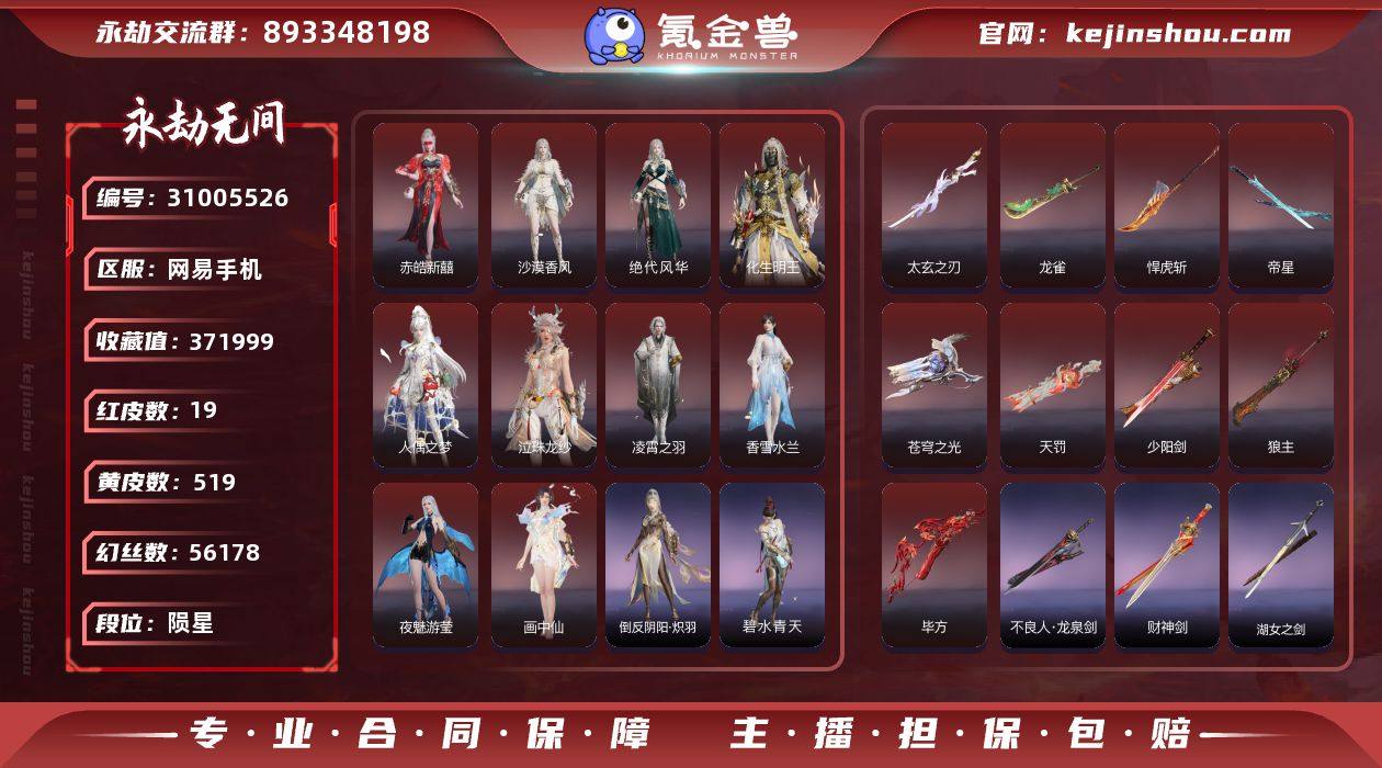 红皮数:19 黄皮数:519 收藏值:371999 幻丝数:56178 等级:405 三排段位:陨星 通行证:未升级 赤皓新囍,沙漠香风,绝代风华,化生明王,人偶之梦,泣珠龙纱,凌霄之羽,香雪水兰,夜魅游莹,画中仙 太玄之刃,龙雀,悍虎斩,帝星,苍穹之光,天罚,少阳剑,狼主,毕方