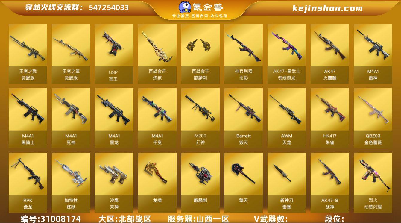 102级/荣耀元首/3英雄/QBZ03-金色蔷薇/HK417-朱雀/M200-幻神/金色小号/M4A1-黑骑士/RPK-盘龙/加特林-炼狱/羊驼玩偶/雷神-小红/COP-白鲨/黄金猫猫手套-白鲨/M4A1-黑骑士音效卡/Barrett-毁灭音效卡/Barrett-极光音效卡/Barrett-碧霄极光音效卡/炼狱-百战金芒-庆典舞曲音效卡/M200-幻神-荣耀世冠白鲨/QBZ03-荣耀世冠白鲨/雷神-暗月/雷神-宇航兔/M4A1-再燃火线/火麒麟-华夏之心/火麒麟-轻羽皮肤/毁灭-星空/毁灭-冠军之怒/黑骑士-暗月/战神-粉色甜心皮肤/战神-紫绶金章皮肤/战神-流金岁月皮肤/AWM-天龙-传奇白鲨/极光-能量核心/修罗-能量核心/屠龙-荣耀世冠AG/轻型军用手斧-再燃火线/擎天-冠军之击/麒麟刺-荣耀世冠白鲨/零/春/王者-瞳-闭月羞花/乔伊教练/暗夜-X/初恋灵狐/芳心审判者/风暴女/嘉年华灵狐/兰-海滩派对/兰-新年限定/灵狐者-X/灵狐者-黄金海岸/龙儿/麻雀/萌儿/潘多拉-X/潘多拉-甜心教官/潜龙队-X/青霞仙子/蜀雪/铁骑荣耀/兔囡囡/新娜塔莎/雪莉杨/雪莉杨-摸金校尉/夜玫瑰-宠粉/影武者-X/异变清道夫-蛇影双骄/AWM-灵狐-15周年嘉年华/迷你深渊冰龙/夺魂/闪光弹-小乔/灵狐娃娃手雷/5烈龙/超级对讲机/暴君乱世-超越/神圣爆裂者/M4A1-千变/AK47-火麒麟/M4A1-黑龙/M4A1-雷神/M4A1-死神/无影-神兵利器/AK47-黑武士-锦绣游龙/QBZ03-独角-III/烈火-动感闪耀/王者之翼-觉醒版/王者之戮-觉醒版/AK47-B-战神/AWM-天龙/Barrett-毁灭/炼狱-百战金芒/烈龙-悦心-觉醒版/沙鹰-天神/USP-冥王/天神-动感闪耀/龙啸/擎天/麒麟刺/屠龙-动感闪耀/斩神刀-雷暴/麒麟刺-百战金芒/高爆手雷-雷霆/高爆手雷-雷暴/高爆手雷-幻灵/手雷-动感闪耀/高爆手雷-玄豹/闪光弹-雷霆/闪光弹-雷暴/闪光弹-幻灵/烟雾弹-雷霆/烟雾弹-雷暴/Barrett-碧霄极光/妩媚妖姬