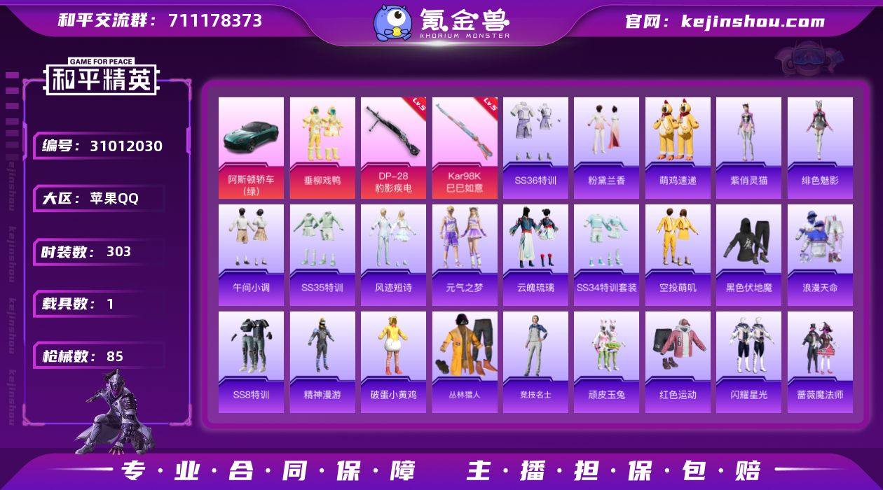 热力值:27154 载具数:1 时装数:303 枪械数:85 战备数:68 游戏等级:56 卓越印记:2 传奇印记:0 绝世印记:0 垂柳戏鸭 五级DP-28-豹影疾电,五级Kar98K-巳巳如意 阿斯顿·马丁DBS(绿) 炫彩糖果降落伞,炫彩糖果飞行器,异瞳寒姬降落伞,喜羊羊与灰太狼降落伞,百万伏特降落伞,幻彩电音降落伞 SS36特训,炫彩糖果,粉黛兰香,绯色魅影,萌鸡速递,紫俏灵猫,风迹短诗,SS35特训,午间小调,元气之梦,云魄琉璃,SS34特训套装,暗夜契约,冰川特警,缤纷果语,北国孤狼,滨海厨神,白糯汤圆,白色伏地魔,白熊同盟,纯白誓言,长空猛禽,丛林猎人,潮萌小黄鸭,传奇侦探,春日漫步,炽焰拳师,翡翠奔狼,飞行日记,格斗专家,黑色刀锋,黑色伏地魔,灰色守护者,黄色运动,红色运动,竞技名士,竞技勇士朋克,精神漫游,空投萌叽,浪漫天命,魅力单车,霓虹街区,霓虹热舞,柠萌假日,破蛋小黄鸡,青春校园,拳皇97草薙京,奇迹天团,青涩时光,蔷薇魔法师,骑行爱好者,青玉碎影,神秘领域,SS18特训,SS19特训,SS20特训,SS21特训,SS31特训套装,SS32特训套装,SS33特训套装,SS6特训,SS7特训,SS8特训,闪耀星光,特战装甲,顽皮玉兔,星光纪元,炫蓝之夏,旭日情侣,夏日音浪,核芯基因,跃动心情,鱼渊荷华,燕燕于飞 ACE32-冰晶雪宝,G36C-霁蓝缠春,铝热弹-炫彩糖果,UZI-炫彩糖果,AKM-霓彩脉冲,Famas-霓彩脉冲,SLR-霓彩脉冲,SVD-霓彩脉冲,DBS-风迹短诗,蜜獾-风迹短诗,MK12-风迹短诗,Mk47-风迹短诗,莫辛纳甘-风迹短诗,破片手榴弹-拽到爆炸,S12K-霓彩脉冲,SCAR-L-彩虹符号,AKM-涂鸦街区,MG-36-薄荷星砂,AC-VAL-天降萌叽,AKM-百万伏特,AKM-霓虹街区,AKM-破晓战魂,AUG-耀粉歌者,AWM-垂柳戏鸭,DBS-彩虹甜喵,DP-28-彩虹符号,DP-28-清新柠檬,GROZA-黑色刀锋,GROZA-异彩先驱,Kar98K-红色方程式,Kar98K-炫彩节奏,Kar98K-星穹咏叹调,M16A4-幻世战舞者,M200-乌木金纹,M249-拳皇97,M249-深山诡影,M416-红色方程式,M417-玩趣呆呆,M762-墨金战记,M762-拳皇97,MG3-幻世战舞者,P92-拳皇97,平底锅-缤纷糖果,平底锅-黑色刀锋,平底锅-精灵梦叶罗丽,平底锅-拳皇97,S12K-华贵君王,S686-红色方程式,SCAR-L-繁花小夜曲,SCAR-L-甜蜜誓约,SCAR-L-炫彩节奏,SPAS-12-狂鲨锋刃,SPAS-12-燕燕于飞,十字弩-燕燕于飞,汤姆逊-耀粉歌者,UMP45-蓝色火焰,UZI-红色方程式,UZI-天降萌叽,Vector-黑色刀锋,Vector-生命誓言,Vector-燕燕于飞,VSS-黑色刀锋,蝎式手枪-燕燕于飞,野牛-燕燕于飞 粉色滑翔尾迹,风迹短诗降落伞,SS35王牌降落伞,百战成名降落伞,鸡智如我飞行器,怪兽之王降落伞,黑色刀锋降落伞,拳皇97降落伞,SS34王牌降落伞,燕燕于飞降落伞 实名:不可二次实名