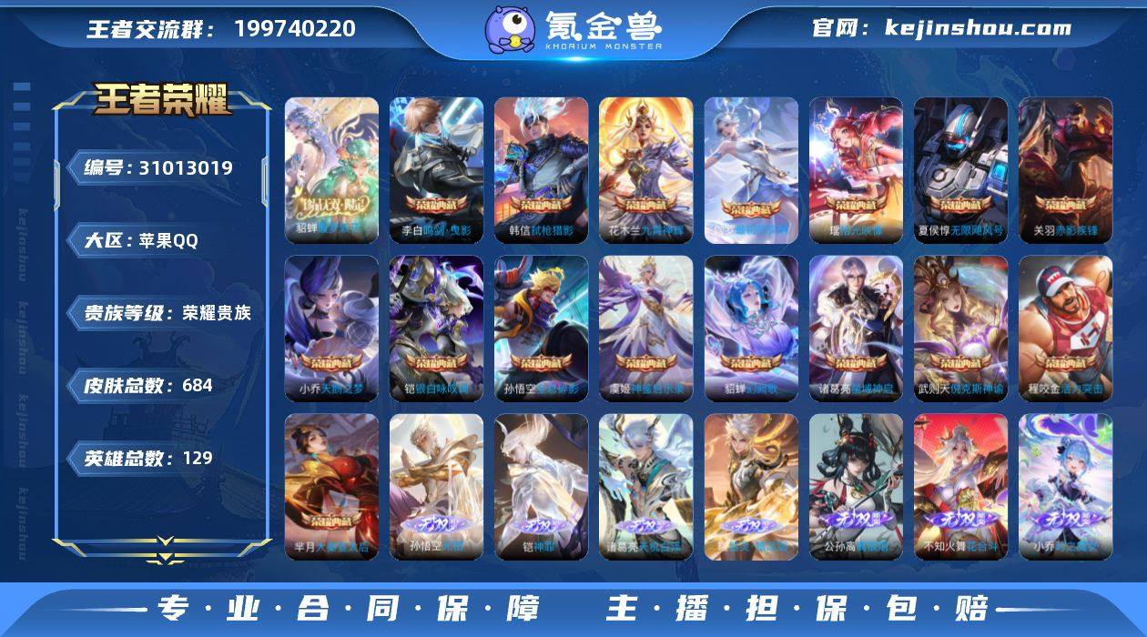 实名: 可修改 贵族等级: 荣耀贵族 英雄数: 129 皮肤数: 684 荣耀水晶: 武则天,天鹅之梦,倪克斯神谕,无限飓风号,活力突击,大秦宣太后,鸣剑·曳影,全息碎影,星域神启,九霄神辉,赤影疾锋,银白咏叹调,幻阙歌,弑枪猎影,神鉴启示录,拾光映像,最初的交响 无双皮: 真我赫兹(瑶),神器·明辉仪,青丘·九尾,碎月剑心,小乔时之魔女,韩信群星魔术团,花合斗,离恨烟,雪境奇遇-甄姬,器灵·螭龙剑,天机白泽,神罪,无相 珍品传说: 江户川柯南,怪盗基德,时之奇旅-孙策,器灵·落星盏,兔狲·蓬尾,酷洛米之心,大耳狗之梦,朽木白哉,黑崎一护 星传说: 零号·雷霆,星际治安官,玉鸾吟,岁雨灵司,破晓神光 传说皮: 黄金狮子座,黄金射手座,冠军飞将,云鹰飞将,绛天战甲,黄金白羊座,猫影幻舞,久胜战神,炽阳神光,一念神魔,云霓雀翎,末日机甲-孙尚香,地狱火,仲夏夜之梦,音你心动-小乔,零号·赤焰,海洋之心,地狱之眼,飞鸢探春,音你心动-周瑜,胖达荣荣,李逍遥,乞巧织情,时之恋人-刘备,游龙清影,淬星耀世,超时空战士-狄仁杰,末日机甲-孙策,花朝如约,无双飞将,音你闪耀,碎云,神器·狴犴令,神器·明辉仪,山海·炽霜斩,山海·琳琅生,山海·苍雷引,炽翼辉光,燃星之曲,画中仙,浮生妄,记忆之芯,电玩·雷克斯,鹤羽星尊,灼幽烈阳,妄想实况,妄想奇谈,惊梅引,遇见神鼓,鲁班七号-时之奇旅,大乔-时之奇旅,小动物乐团,霜月吟,澜逐花归海,艾琳觅芳踪,琥珀纪元铠,琥珀纪元马超,乘龙·问璇玑,乘龙·铭钟鼎,乘龙·淬吴钩,貂蝉曦玄引,吕布曦玄引,典韦战鼓燎原,落雪白狼,金乌负日,黄金天蝎座,云中君群星魔术团,朵莉亚心动手记,铠冥王哈迪斯,启明星使,玄雷天君,幻光神枪,祥瑞亨通,星之鸣奏,千劫归真,续相思,云诺千山,九山相柳,死亡执政官,诡秘之主,万灵伏威,神树通天,纵目迁山 限定皮: 冰锋战神,李小龙,祈雪灵祝,梁祝,云端筑梦师,时雨天司,引擎之心,龙胆,白鹤梁神女,武圣,烈魂,魔法小厨娘,辉光...