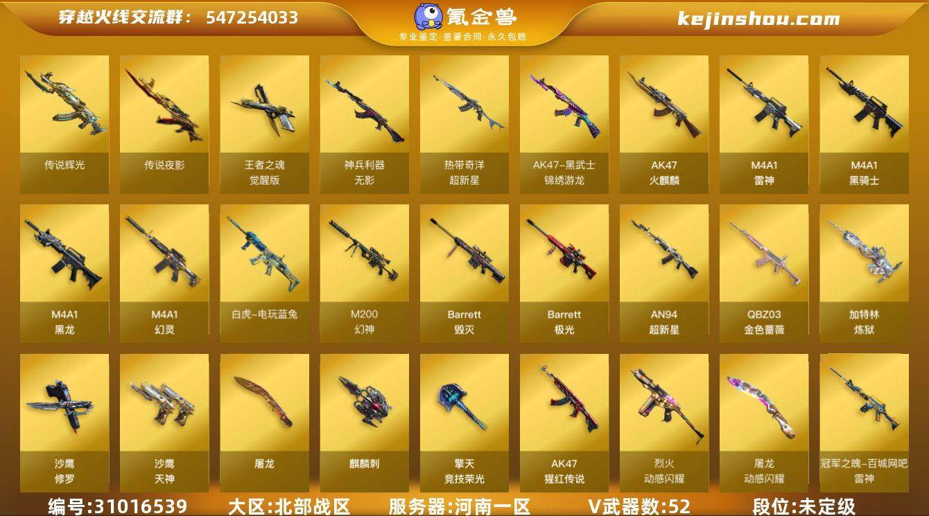 河南一区-53V-6王者-1炫金 【传说武器】:传说辉光,传说夜影 【热门武器】:传说夜影,传说辉光,QBZ03-金色蔷薇,M200-幻神,死亡之眼,白虎-电玩蓝兔,牛牛-AK47,M4A1-黑骑士,加特林-炼狱*2,羊驼玩偶*2,沙鹰-修罗*2 【王者炫金武器】:王者青龙,炫金武士 【音效卡】:M200-幻神音效卡,M4A1-黑骑士音效卡,Barrett-毁灭音效卡,死神-雪域霜狐-怀旧音效卡 【皮肤】:幻神-宠儿-2021MVP,雷神-星空,雷神-冠军之魄,雷神-传奇N9,雷神-源计划2.0专属 皮肤,火麒麟-雷神,AK47-火麒麟-传奇EVEN,火麒麟-轻羽皮肤,火麒麟-平天大圣,火麒麟-心动糖果,毁灭-战神张飞,毁灭-黑大圣皮肤,毁灭-风暴,M4A1-千变-孔明皮肤,黑骑士耀金皮肤,黑骑士-冠军之势,战神-紫绶金章皮肤,战神-流金岁月皮肤,AK47-B-常胜将军-刘备,修罗-能量核心 【角色】:葵,王者葵-惊若翩鸿,堕落女神,雪域霜狐,奇洋探员,乔伊教练,云海玲珑,空,暗夜-X,北极狐-X,初恋灵狐,电竞少女,芳心审判者,飞虎队-X,风暴女,嘉年华灵狐,0号玩家,灵动武士,灵狐者-黄金海岸,龙儿,麻雀,潘多拉-X,潜龙队-X,斯沃特-X,影武者-X,幽,游珑儿 【人偶武器】:天龙-曼陀罗,火麒麟-灵狐,M4A1-雷神-精英刀锋,AWM-灵狐-15周年嘉年华*2,海滩汪汪-巴雷特,牛牛-AK47,迷你超能女侍 【暴走生化】:死亡之眼,超级对讲机 【挑战大师】:冰龙粉碎者-白马银枪,神圣爆裂者-末日III 【英雄级武器】:AK47-火麒麟,M4A1-黑龙,M4A1-雷神,M4A1-黑骑士,AN94-超新星,M4A1-幻灵,无影-神兵利器,黑武士-锦绣游龙,超新星-热带奇洋,QBZ03-金色蔷薇,烈火-动感闪耀,AK-47-猩红传说*4,王者冰魄-觉醒版,王者龙血-觉醒版,白虎-电玩蓝兔,Barrett-毁灭,Barrett-极光,M200-幻神,加特林-炼狱*2,盘龙-悦心-觉醒版,沙鹰-修罗*2,沙鹰-天神,王者...