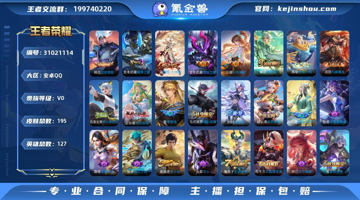 贵族等级:V0 典藏皮肤数:1 珍品无双皮肤数:0 无双皮肤数:0 珍品传说皮肤数:0 传说皮肤数:4 史诗皮肤数:39 皮肤数:195 英雄数:127 段位:钻石 卖家说:可刀