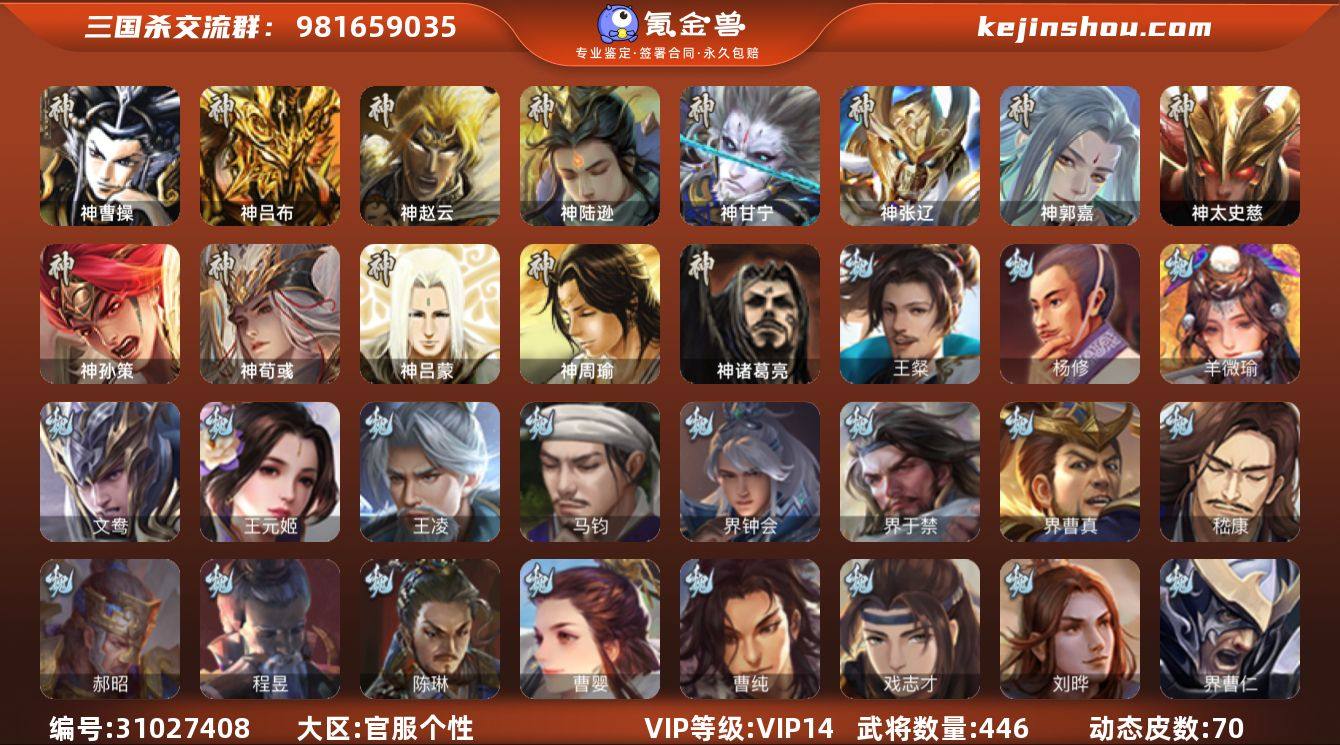 VIP等级: VIP14 官阶: 大将军 武将数量: 446 动态皮肤数量: 70 神将: 神曹操,神甘宁,神郭嘉,神陆逊,神吕布,神孙策,神太史慈,神荀彧,神张辽,神赵云,神吕蒙,神周瑜,神诸葛亮 魏国武将: 刘晔,戏志才,曹纯,曹婴,陈琳,程昱,郝昭,嵇康,界曹真,界于禁,界钟会,马钧,王凌,王元姬,文鸯,羊徽瑜,杨修,王粲,唐咨-魏,张辽,SP蔡文姬,SP曹仁,SP关羽,SP贾诩,SP姜维,SP庞德,卞夫人,蔡贞姬,曹昂,曹操,曹冲,曹洪,曹丕,曹仁,曹叡,贾逵,王异,张恭,鲁芝,界满宠,曹休,界曹植,满宠,荀攸,王基,钟繇,蒯越蒯良,郭嘉,荀彧,阮慧,杜畿,界郭嘉,崔琰,界曹丕,界荀彧,朱灵,界甄姬,辛毗,吕虔,界王异,界许褚,界郭淮,华歆,陈群,界邓艾,界典韦,袁涣,李通,乐进,辛宪英,郭淮,毛玠,界曹彰,郭皇后,毌丘俭,夏侯惇,曹植,司马朗,谋于禁,界曹操,许褚,界张辽,谋徐晃,张郃,钟会,文聘,曹彰,界夏侯惇,诸葛诞,司马懿,甄姬,界徐晃,徐晃,界曹仁,孙资刘放,韩浩史涣,胡班,曹真,典韦,界夏侯渊,夏侯渊,李典,于禁,王双,邓艾,界司马懿,张春华,孟达-魏,臧霸,牛金,朱灵(国战),董昭 蜀国武将: 董允,关索,花鬘,界黄忠,傅佥,谯周,沙摩柯,王平,张星彩,赵襄,周群,诸葛瞻,谋马超,谋赵云,谋夏侯氏,谋黄忠,蜀-谋孙尚香,马云騄,徐庶,界魏延,杨仪,吕凯,界关羽,界诸葛亮,邓芝,界伊籍,胡金定,费祎,严颜,界黄月英,赵云,张松,李丰,界刘备,界刘禅,刘封,糜竺,蒋琬,谋庞统,黄月英,关羽,王甫赵累,吴懿,界廖化,向宠,祝融,张飞,黄皓,魏延,界周仓,马忠,界法正,糜夫人,界孟获,刘禅,界赵云,界姜维,张翼,关银屏,界祝融,SP孙尚香,SP徐庶,卧龙诸葛,宗预,周仓,简雍,界关兴张苞,诸葛亮,孙乾,界张飞,界卧龙诸葛,法正,界简雍,赵统赵广,陈到,界马岱,关平,马岱,界庞统,庞统,诸葛果,马谡,马超,霍峻,廖化,关兴张苞,孟获,秦宓,吴苋,夏侯氏,姜维,黄忠,刘备,界马超,李严,马良,傅肜,蒋琬费祎,许靖,刘谌,甘夫人,蜀-糜芳傅...