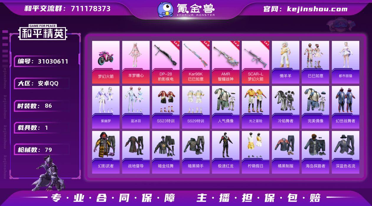 安卓 手Q-1粉装-4特效枪-1载具-1粉色飞行器-25511热力值-1王牌印记-86套装-79枪皮 【粉色套装】:角色-羊梦糖心 【粉色枪皮等级】:SCAR-L-梦幻火箭(一级),Kar98K-巳巳如意(五级),AMR-智耀战神(三级),DP-28-豹影疾电(五级) 【粉色载具】:双人摩托-梦幻火箭 【粉色枪皮】:SCAR-L-梦幻火箭,Kar98K-巳巳如意,AMR-智耀战神,DP-28-豹影疾电 【粉色降落伞】:江南烟雨降落伞,鬼刀降落伞,智耀战神降落伞,星穹咏叹调降落伞,无垠阁降落伞,炫彩糖果降落伞 【稀有套装】:套装-巳巳如意,套装-雪国风尚,套装-炫彩糖果,角色-都市丽猫,套装-紫幽梦,套装-蓝冰羽,玩偶服-懒羊羊,角色-霜刃之御 【稀有枪皮】:AKM-破晓战魂,M16A4-幻世战舞者,AUG-天降萌叽,AUG-耀粉歌者,Vector-生命誓言,汤姆逊-炫彩节奏,汤姆逊-智耀战神,AKS-74U-鬼刀,P90-巳巳如意,Kar98K-红色方程式,M24-炫彩节奏,Mini14-炫彩节奏,M417-惊鸿侠骨,M200-惊鸿侠骨,S686-彩虹符号,S686-生命誓言,S686-巳巳如意,DBS-彩虹符号,DBS-月下星之子,M249-破晓战魂,MG3-惊鸿侠骨,MG3-智耀战神,破片手榴弹-巳巳如意 【其他套装】:套装-SS23特训,套装-SS29特训,套装-人气偶像,套装-光之冒险,套装-冷焰舞者,套装-完美偶像,套装-幻世战舞者,套装-幻影武者,套装-战地督导,套装-暗金炫舞,套装-暗黑骑手,套装-极速红龙,套装-柠萌假日,套装-橘黑制服,套装-海岛探路者,套装-深蓝色名流,套装-湖蓝色名流,套装-灼焰舞者,套装-烈火街头,套装-特战装甲,套装-特训学院,套装-猎鹰,套装-猛禽,套装-玉兔迎春,套装-王牌教练,套装-白色伏地魔,套装-破晓战魂,套装-破蛋小黄鸡,套装-竞技名士,套装-竞技达人朋克,套装-红色运动,套装-绮丽涂鸦,套装-缤纷果语,套装-耀眼新星,套装-耀粉歌者,套装-蓝彩潮人,套装-蓝色运...