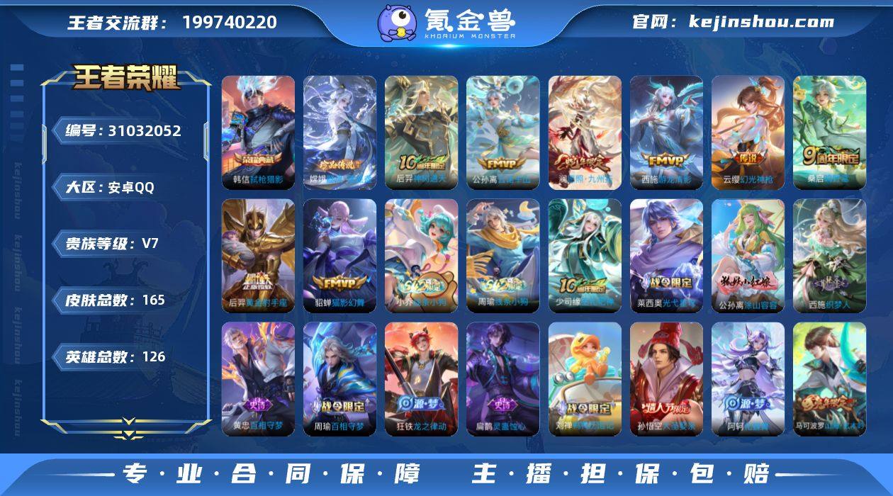 贵族等级:V7 典藏皮肤数:1 珍品无双皮肤数:0 无双皮肤数:0 珍品传说皮肤数:1 传说皮肤数:8 史诗皮肤数:51 皮肤数:165 英雄数:126 段位:王者