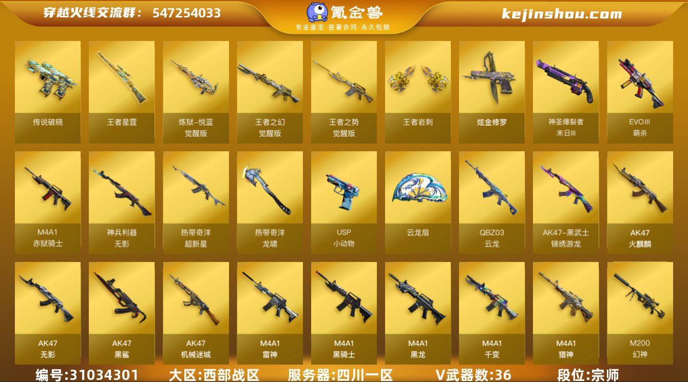 段位:宗师 VIP等级:VIP6 V武器数:36 王者武器数:5 炫金武器数:1 传说破晓 王者星霆,炼狱-悦蓝-觉醒版,王者之幻-觉醒版,王者之势-觉醒版,王者岩刺 炫金修罗 EVOⅢ-萌杀,神圣爆裂者-末日III,M4A1-赤狱骑士,无影-神兵利器,超新星-热带奇洋,龙啸-热带奇洋,USP-小动物,云龙扇,QBZ03-云龙,AK47-黑武士-锦绣游龙,AK47-火麒麟,AK47-无影,AK47-黑鲨,AK47-机械迷城,M4A1-雷神,M4A1-黑骑士,M4A1-黑龙,M4A1-千变,M4A1-猎神,M200-幻神,Barrett-毁灭,Barrett-极光,蔷薇大炮,AWM-天龙,AN94-超新星,HK417-朱雀,QBZ03-金色蔷薇,Scar Light-白虎,屠龙,炽芒蝶刃,M200-竞技荣光,柯尔特-竞技荣光,USP-雷暴,擎天-竞技荣光,AK-47-猩红传说,裁决,天神,G36C-幻影,龙啸-烈火龙威,擎天-云海游龙 王者空,王者-零-华冠丽服,王者-迷迭香,王者樱-热浪之夏 电竞教官-云悠悠,华,灵动武士,樱-青春偶像,雨墨 天罚音效卡,云海游龙音效卡,M200-幻神音效卡,M4A1-黑骑士音效卡,Barrett-毁灭音效卡,M4A1-雷神音效卡