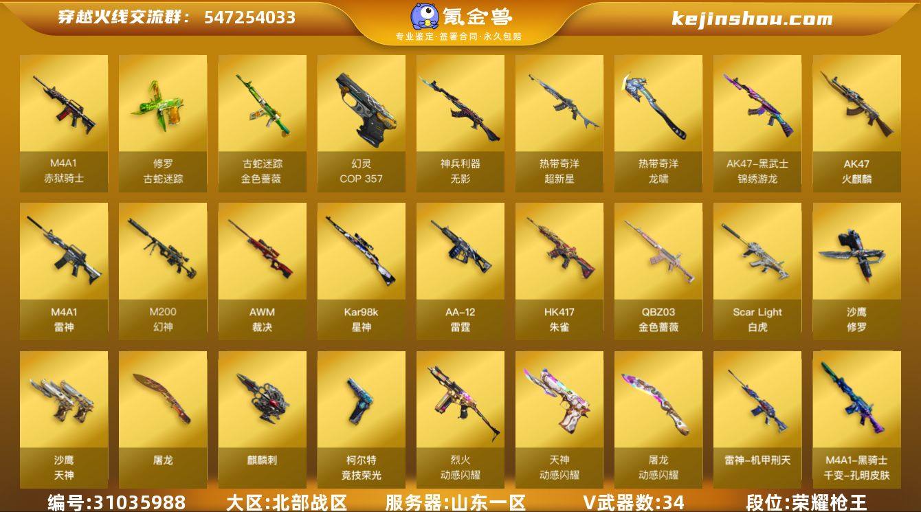 【ky4314】山东一区-34V-7王者-0炫金 【热门武器】:QBZ03-金色蔷薇,Scar Light-白虎,HK417-朱雀,M200-幻神,金色蔷薇-古蛇迷踪,修罗-古蛇迷踪,Kar98K-星神,Cat-刀锋,牛牛-AK47,COP 357-幻灵,沙鹰-修罗*2 【皮肤】:M200-幻神-黄忠皮肤,幻神-宠儿-2021MVP,M200-幻神-N9-2022MVP,幻神-荣耀世冠EP 皮肤,Kar98K-星神-冠军之星皮肤,雷神-暗月,雷神-耀金皮肤,雷神-机甲刑天皮肤,火麒麟-平天大圣,火麒麟-百城,火麒麟-心动糖果,M4A1-千变-孔明皮肤,屠龙-荣耀之锋 【角色】:王者炫,蛇隐宗,奇洋探员,乔伊教练,修道士,暗夜-X,飞虎队-X,嘉年华灵狐,兰-新年限定,灵狐-花神,灵狐者-X,曼陀罗-X,曼陀罗-礼服,女主播,潘多拉-X,潘多拉-甜心教官,青霞仙子,蛇姬,斯沃特-X,铁骑荣耀,兔囡囡,新娜塔莎,夜玫瑰-幻能朋克,影武者-X,幽 【人偶武器】:天龙-乔伊教练,迷你宝贝,AWM-灵狐-15周年嘉年华,Cat-刀锋,牛牛-AK47,迷你深渊冰龙,迷你波特博士,夺魂*2,迷你火种,生化手雷-机甲核心*2 【暴走生化】:超级对讲机 【挑战大师】:冰龙粉碎者-白马银枪,激光毁灭者III-白马银枪,激光毁灭者III,试炼破坏者III,神圣爆裂者-末日III 【英雄级武器】:AK47-火麒麟,M4A1-雷神,HK417-朱雀,Scar Light-白虎,QBZ03-天罚,无影-神兵利器,黑武士-锦绣游龙,超新星-热带奇洋,金色蔷薇-古蛇迷踪,QBZ03-金色蔷薇,烈火-动感闪耀,AWM-裁决,M200-幻神,Kar98K-星神,AA-12-雷霆,沙鹰-修罗*2,沙鹰-天神*2,COP 357-幻灵,柯尔特-竞技荣光,天神-动感闪耀,修罗-古蛇迷踪,屠龙,麒麟刺,屠龙-动感闪耀,龙啸-热带奇洋,高爆手雷-幻灵*3,手雷-动感闪耀,高爆手雷-云龙,手雷-热带奇洋,高爆手雷-古蛇迷踪,闪光弹-幻灵,闪光弹-云龙*2,闪光弹-雷霆王者-觉醒版*3,烟雾弹-云龙,烟雾弹-古...