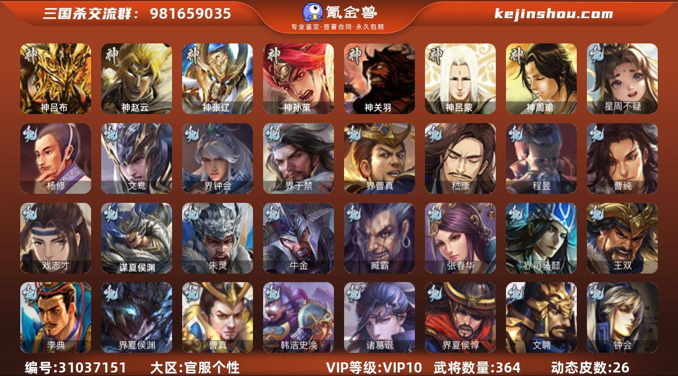 VIP等级: VIP10 官阶: 大将军 武将数量: 364 动态皮肤数量: 26 神将: 神吕布,神孙策,神张辽,神赵云,神关羽,神吕蒙,神周瑜 魏国武将: 戏志才,曹纯,程昱,嵇康,界曹真,界于禁,界钟会,文鸯,杨修,唐咨-魏,张辽,SP蔡文姬,SP曹仁,SP关羽,SP贾诩,SP姜维,SP庞德,卞夫人,曹昂,曹操,曹冲,曹洪,曹丕,曹仁,曹叡,王异,鲁芝,界满宠,界曹植,满宠,荀攸,王基,钟繇,蒯越蒯良,郭嘉,荀彧,阮慧,杜畿,界郭嘉,崔琰,界曹丕,界荀彧,朱灵,界甄姬,吕虔,界王异,界许褚,界郭淮,华歆,陈群,界邓艾,界典韦,界曹休,袁涣,李通,乐进,郭淮,郭皇后,夏侯惇,曹植,司马朗,界曹操,星周不疑,许褚,界张辽,谋徐晃,张郃,钟会,文聘,曹彰,界夏侯惇,诸葛诞,司马懿,甄姬,徐晃,韩浩史涣,曹真,典韦,界夏侯渊,夏侯渊,李典,于禁,王双,邓艾,界司马懿,张春华,臧霸,牛金,朱灵(国战),谋夏侯渊 蜀国武将: 董允,关索,花鬘,界黄忠,沙摩柯,张星彩,赵襄,周群,诸葛瞻,谋马超,谋黄月英,徐庶,界魏延,杨仪,吕凯,界关羽,界诸葛亮,邓芝,界伊籍,胡金定,费祎,严颜,界黄月英,界张嶷,赵云,张松,彭羕,李丰,界刘备,谋法正,谋姜维,刘封,糜竺,李遗,谋庞统,黄月英,刘巴,关羽,王甫赵累,吴懿,向宠,祝融,张飞,黄皓,魏延,界周仓,界法正,糜夫人,刘禅,界赵云,界姜维,张翼,关银屏,SP孙尚香,SP徐庶,卧龙诸葛,周仓,简雍,界关兴张苞,诸葛亮,界张飞,界卧龙诸葛,法正,赵统赵广,陈到,界马岱,关平,马岱,界庞统,庞统,诸葛果,谋张飞,马谡,马超,廖化,关兴张苞,孟获,夏侯氏,姜维,黄忠,刘备,界马超,李严,马良,傅肜,蒋琬费祎,刘谌,彭羕(国战),甘夫人,蜀-糜芳傅士仁,SP甘夫人,势陈祗 吴国武将: 界步练师,界徐盛,留赞,骆统,文鸯,界朱桓,潘濬,陆绩,张温,周泰,全琮,吕蒙,诸葛恪,界孙尚香,界顾雍,大乔小乔,谋周瑜,许贡,丁奉,谋吕蒙,周鲂,孙茹,蒋钦,顾雍,阚泽,孙亮,界朱治,孙休,严畯,界孙权,孙翊,界孙休,界凌统,谋孙策,祖茂,...
