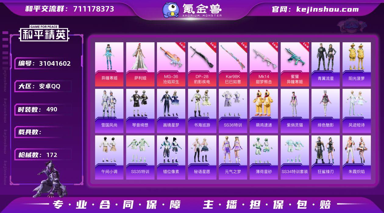 萨利娅!异瞳寒姬!蜜獾-异瞳寒姬!4.7万热力值!特权卡余300天!D11171.安卓QQ.122套装2分钟159枪皮5粉枪. 【稀有资产】套装-粉红小猪/套装-龟仙人/套装-迅捷狂鲨/套装-冷酷挑战者/M416-快乐主宰 【赛事队服】套装-NV战队服 【粉色套装】角色-异瞳寒姬/角色-萨利娅 【粉色枪皮】Kar98K-巳巳如意[5级]/Mk14-甜梦熊击[5级]/DP-28-豹影疾电[5级]/MG-36-沧焰双生[5级]/蜜獾-异瞳寒姬[4级] 【飞行器】炫彩糖果飞行器 【珍稀背包】百万伏特背包(1级)/甜心宝贝背包(2级)/炫彩节奏背包(3级)/荧海星豚背包(3级)/炫彩节奏背包(2级)/荧海星豚背包(2级)/荧海星豚背包(1级)/