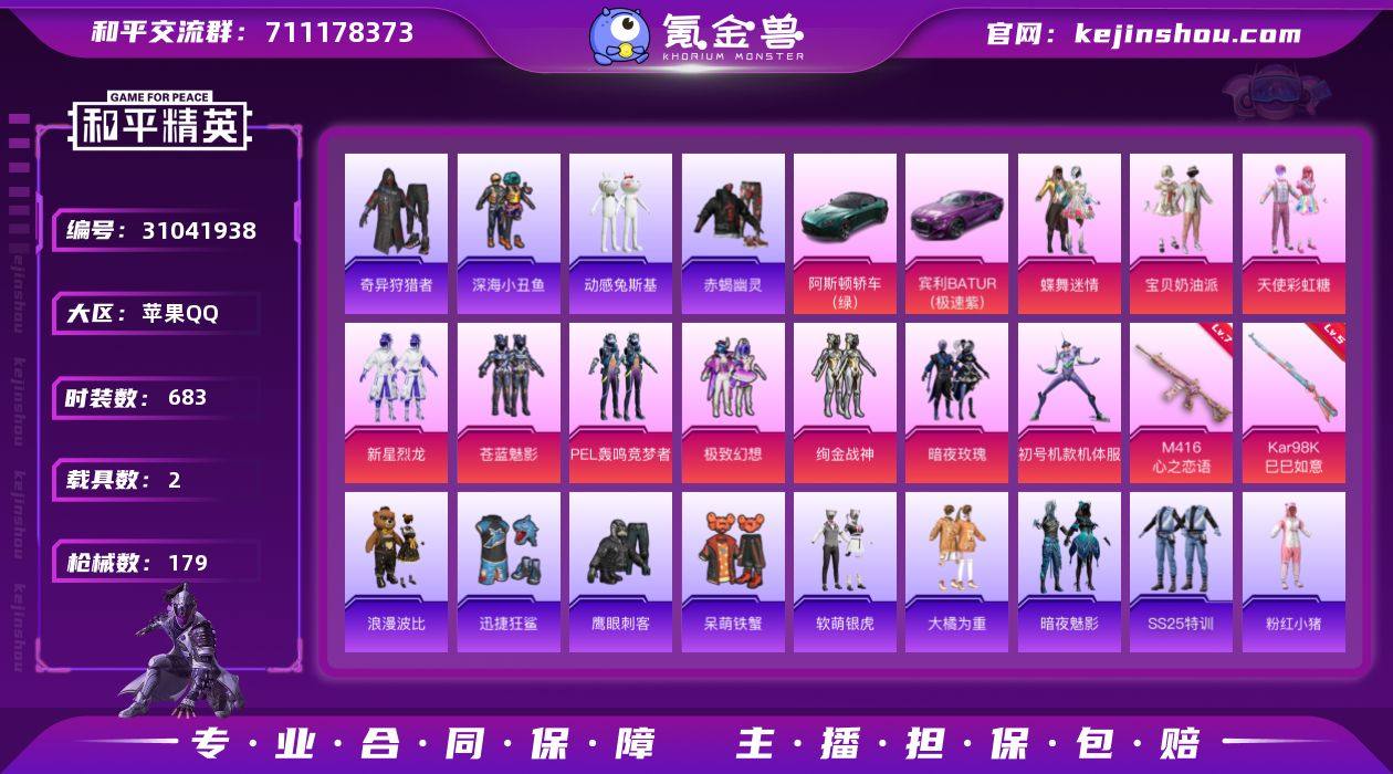 紫螳螂!蝶舞迷情!小白龙!奇异狩猎者!宾利BATUR(极速紫)!满级心之恋语!6.7玩热力值!D10712.IOSQQ.173套装10粉装2载具152枪皮2粉枪.深海小丑鱼.赤蝎. 【稀有资产】角色-初号机款机体服/角色-明日香款战斗服/角色-零款战斗服/套装-赤蝎幽灵/套装-奇异狩猎者/套装-暗夜魅影/套装-粉红小猪/套装-雪山精英/套装-暗影哥特/套装-迅捷狂鲨/套装-浪漫波比/角色-许七安/套装-动感兔斯基人偶服/套装-狂沙舞者/M416-仓鼠灰灰 【赛事队服】套装-NV战队服 【粉色套装】套装-宝贝奶油派/套装-天使彩虹糖/套装-蝶舞迷情/套装-PEL轰鸣竞梦者/套装-新星烈龙/套装-极致幻想/套装-苍蓝魅影/套装-绚金战神/套装-暗夜玫瑰 【粉色枪皮】M416-心之恋语[7级]/Kar98K-巳巳如意[5级] 【载具】阿斯顿·马丁DBS(绿)/宾利BATUR(极速紫) 【飞行器】星之信仰飞行翼/霓虹街区飞行器 【珍稀背包】百万伏特背包(3级)/