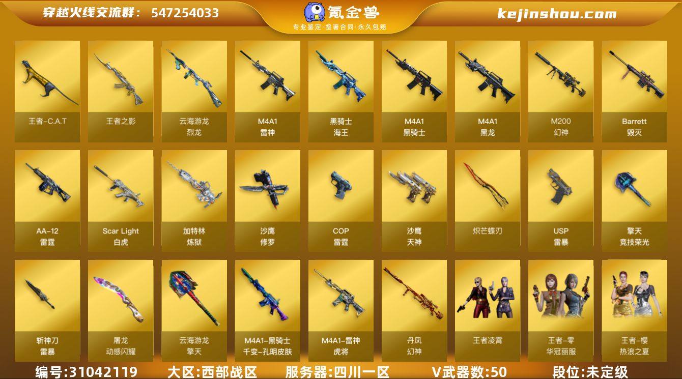 四川一区-53V-3王者-0炫金 【热门武器】:Scar Light-白虎,M200-幻神,Kar98K-星神,C.A.T,M4A1-黑骑士*2,加特林-炼狱,USP-雷暴,沙鹰-修罗*3,炽芒蝶刃 【王者炫金武器】:王者之影 【音效卡】:AN94-超新星-热带奇洋音效卡,M200-幻神音效卡,Barrett-毁灭音效卡 【皮肤】:幻神-丹凤,Scar Light-白虎-暗星,金色蔷薇-破浪逐光 皮肤,雷神-虎将,雷神-源计划2.0专属 皮肤,火麒麟-百城,毁灭-虹光风暴 皮肤,M4A1-千变-孔明皮肤 【角色】:樱,华,战地猎狐,王者零-华冠丽服,王者凌霄,奇洋探员,乔伊教练,修道士,云海玲珑,暗夜-X,芳心审判者,飞虎队-X,风暴女,嘉年华灵狐,兰妹妹,猎狐者-追月,灵狐-花神,灵狐者-X,麻雀,潘多拉-X,青霞仙子,蛇姬,铁骑荣耀,雪莉杨-摸金校尉,夜玫瑰-幻能朋克,游珑儿 【人偶武器】:白虎-迷你小艾,迷你宝贝,迷你地狱终结者,AWM-灵狐-15周年嘉年华,C.A.T,迷你深渊冰龙,迷你波特博士,迷你曼提柯尔,夺魂,迷你火种*2,生化手雷-机甲核心*3,深渊终结者手雷,迷你巨石泰坦-魔花研究所,灵狐娃娃手雷*3 【暴走生化】:超级对讲机 【挑战大师】:暴君乱世-超越Max,神圣爆裂者III,冰龙粉碎者-白马银枪*2,激光毁灭者III-白马银枪,VEPR-12-金魔,激光毁灭者III*2,机甲撕裂者III,试炼破坏者III*2,KAC-圣炎切割者III,神圣爆裂者-末日III,阐释者III,惩戒者III 【英雄级武器】:M4A1-黑龙,M4A1-雷神,M4A1-黑骑士*2,Scar Light-白虎,王者之城-觉醒版,黑骑士-海王,QBZ-03-王者蔷薇-觉醒版,Barrett-毁灭,M200-幻神,Kar98K-星神,加特林-炼狱,烈龙-云海游龙,AA-12-雷霆,沙鹰-修罗*3,沙鹰-天神*3,USP-雷暴,COP-雷霆,天神-动感闪耀,擎天-竞技荣光,炽芒蝶刃,屠龙-动感闪耀*2,擎天-云海游龙,斩神刀-雷暴,高爆手雷-雷霆,高爆手雷-雷