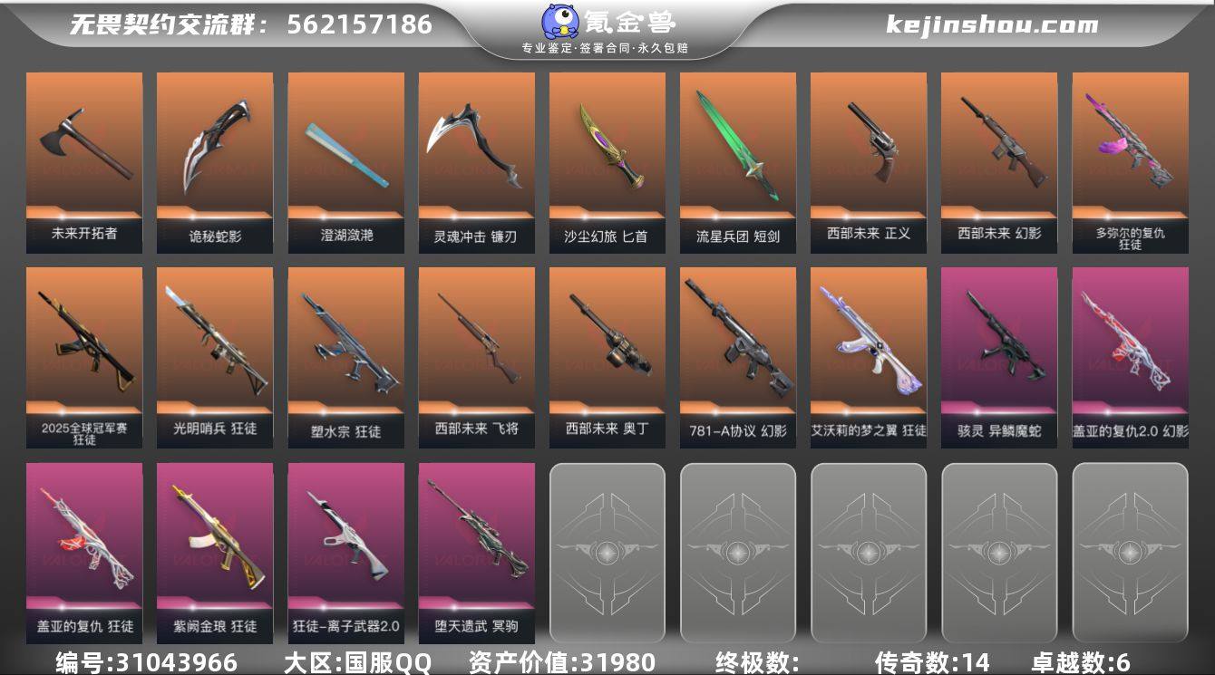 SF14【 QQ账号 可二次 可排位 已用无畏点数 31980 已用源晶点数 1285 西部未来 澄湖潋滟,灵魂冲击-镰刃,流星兵团-短剑,沙尘幻旅-匕首,未来开拓者,诡秘蛇影-军刀 艾沃莉的梦之翼-狂徒,光明哨兵-狂徒,塑水宗-狂徒,盖亚的复仇-狂徒,紫阙金琅-狂徒,离子武器//2.0-狂徒,2025全球冠军赛-狂徒,多弥尔的复仇-狂徒 781-A协议-幻影,盖亚的复仇//2.0-幻影,西部未来-幻影 西部未来-正义 异鳞魔蛇-骇灵 西部未来-飞将 堕天遗武-冥驹 纤云弄巧-莽侠 西部未来-奥丁】