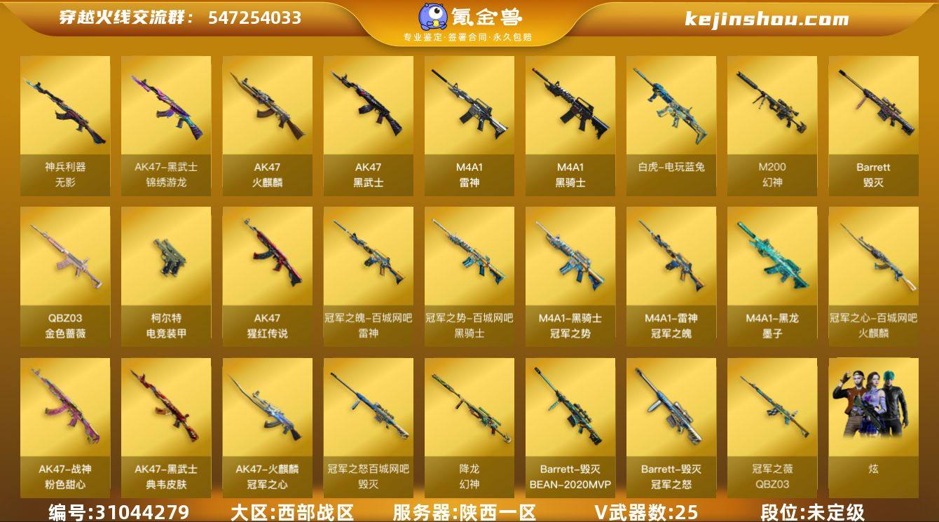 陕西一区-26V-1王者-0炫金 【热门武器】:QBZ03-金色蔷薇,M200-幻神,白虎-电玩蓝兔,柯尔特-冠军之特*2,Kar98K-星神,M4A1-黑骑士,Knife-冠军之刃 【皮肤】:幻神-降龙,QBZ03-冠军之薇,雷神-冠军之魄,火麒麟-冠军之心,毁灭-冠军之怒,毁灭-BEAN-2020MVP,黑龙-墨子皮肤,黑骑士-冠军之势,黑武士-典韦皮肤,战神-粉色甜心皮肤 【角色】:沙漠玫瑰,初恋灵狐,芳心审判者,嘉年华灵狐,灵狐者-X,潘多拉-X,斯沃特-X,兔囡囡 【人偶武器】:天龙-曼陀罗,AWM-灵狐-15周年嘉年华*2,迷你牛魔王,迷你超能女侍 【暴走生化】:超级对讲机 【挑战大师】:冰龙粉碎者-白马银枪,试炼破坏者III,神圣爆裂者-末日III 【英雄级武器】:AK47-火麒麟,M4A1-雷神,M4A1-黑骑士,AK47-黑武士,无影-神兵利器,黑武士-锦绣游龙,QBZ03-金色蔷薇,AK-47-猩红传说*2,QBZ-03-王者蔷薇-觉醒版,白虎-电玩蓝兔,Barrett-毁灭,M200-幻神,Kar98K-星神,Barrett-金色蔷薇,柯尔特-冠军之特*2,柯尔特-电竞装甲*2 【道具】:AG战队炫彩背包,云山科技背包,亚洲杯纪念炫彩背包,全能枪王背包,炫彩背包,虎牙炫彩背包,女皇终结者-魔龙之吻,救世主-黑桃战神,绿色巨人,灵魂忍者,迷雾幽灵,夺命之镰,防化服*3,金色流光-枪王排位*2,星辰流光-枪王排位,枪王排位28赛季金色流光,枪王排位29赛季金色流光,电玩兔兔表情,防弹头盔*5,防弹衣*5,C4工具钳*5,手雷包*5 【特殊枪械】:1黑骑士
