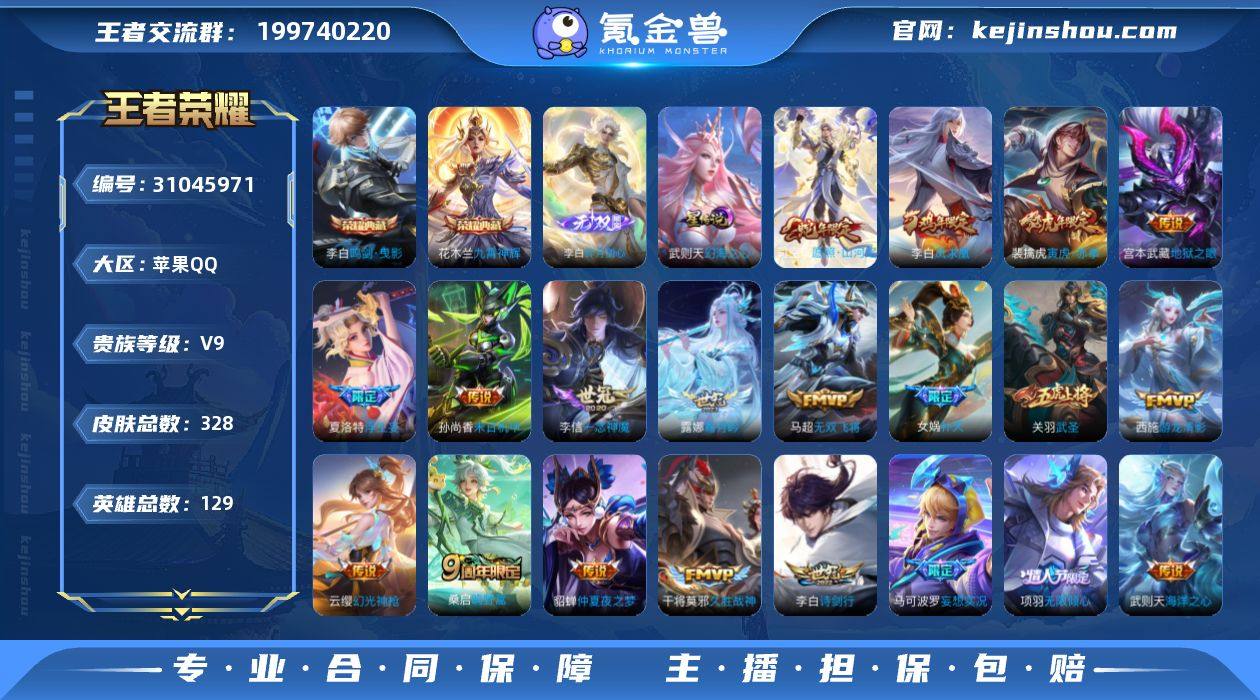 苹果Q-V9-至尊星耀IV段位-129英雄-328皮肤-2典藏-0珍品无双-1无双-0珍品传说-22传说-90史诗【英雄全皮】:钟馗全皮,司空震全皮,空空儿全皮【荣耀典藏】:武则天英雄,李白鸣剑曳影,花木兰九霄神辉【无双皮肤】:李白碎月剑心【传说皮肤】:司空震愿照山河定,云缨幻光神枪,桑启鸣野蒿,露娜霜月吟,马可波罗妄想实况,张飞百相守梦,夏洛特浮生妄,项羽无限倾心,李白诗剑行,马超无双飞