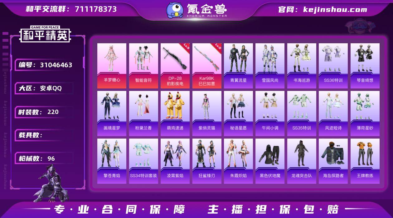 热力值:25006 时装数:220 枪械数:96 战备数:67 游戏等级:59 卓越印记:3 传奇印记:3 绝世印记:3 羊梦糖心,智能音符 五级DP-28-豹影疾电,五级Kar98K-巳巳如意 绝对恒星降落伞,炫彩糖果降落伞,炫彩糖果飞行器,异瞳寒姬降落伞,创世·救赎降落伞,幻影战神降落伞,星穹咏叹调降落伞 青翼流星,雪国风尚,画境星梦,琴音绮想,书海巡游,SS36特训,炫彩糖果,粉黛兰香,萌鸡速递,紫俏灵猫,风迹短诗,秘语星愿,SS35特训,午间小调,薄荷星砂,狂鲨锋刃,凌霄紫焰,擎苍青焰,SS34特训套装,朱霞炽焰,8号机,缤纷果语,冰河战士,白色伏地魔,纯真浪花,顶瓜瓜,蝶变,海岛探路者,湖蓝色名流,幻世保卫者,黑色伏地魔,幻影公爵,竞技名士,街头风暴,龙魂突击队,恋语绒绒,魅力单车,蜜桃派对,柠萌假日,破蛋小黄鸡,热情海星,忍者信条,SS31特训套装,SS32特训套装,SS33特训套装,特战装甲,王牌教练,旭日情侣,星途旅人,鱼渊荷华,燕燕于飞,异域银装,智谋强哥 燃烧瓶-福马献瑞,ACE32-冰晶雪宝,PKM-啾咪啾咪,AA12-G-画境星梦,ACE32-画境星梦,AUG-绝对恒星,M1加兰德-画境星梦,MK12-乌木金纹,MP5K-画境星梦,平底锅-画境星梦,AUG-冰晶雪宝,铝热弹-炫彩糖果,UZI-炫彩糖果,撬棍-冰晶雪宝,AKM-霓彩脉冲,Famas-霓彩脉冲,SLR-霓彩脉冲,SVD-霓彩脉冲,十字弩-异瞳寒姬,信号枪-异瞳寒姬,DBS-风迹短诗,蜜獾-风迹短诗,MK12-风迹短诗,Mk47-风迹短诗,莫辛纳甘-风迹短诗,破片手榴弹-拽到爆炸,S12K-霓彩脉冲,SCAR-L-彩虹符号,破片手榴弹-火尖莲影,AMR-喜羊羊与灰太狼,M249-冰晶雪宝,MG-36-薄荷星砂,突击盾牌-绝对恒星,AA12-G-纯真浪花,AKS-74U-鬼刀,ARX-凌霄紫焰,AUG-幻影战神,AWM-纯真浪花,G36C-星穹咏叹调,GROZA-海盐豹豹,JS9-凌霄紫焰,Kar98K-影袭,M16A4-冰河战士,M200-乌木金纹,M249-彩虹符号,M416-蓝色火焰,MG-36-凌霄紫焰,MG3-幻世战舞者,Mini14-香桃花海,Mk14-冰河战士,MK20-H-星途旅人,MK20-H-狂鲨锋刃,P90-巳巳如意,P92-凌霄紫焰,平底锅-纯真浪花,平底锅-凌霄紫焰,破片手榴弹-巳巳如意,QBZ-纯真浪花,撬棍-突变脉冲,S12K-幻影战神,S12K-玩趣呆呆,S12K-夜灯,SCAR-L-夜灯,SCAR-L-玉兔迎春,SPAS-12-狂鲨锋刃,SPAS-12-燕燕于飞,十字弩-燕燕于飞,突击盾牌-初号机 觉醒Ver.,汤姆逊-纯真浪花,汤姆逊-幻影战神,UMP45-生命誓言,UMP45-夜灯,UZI-冰河战士,UZI-幻影战神,UZI-天降萌叽,UZI-炫彩节奏,UZI-影袭,Vector-生命誓言,Vector-燕燕于飞,VSS-香桃花海,蝎式手枪-燕燕于飞,野牛-燕燕于飞 画境星梦降落伞,SS36王牌降落伞,顶峰精英尾迹,异域银装飞行器,登顶巅峰飞行器,风迹短诗降落伞,SS35王牌降落伞,百战成名降落伞,鸡智如我飞行器,狂鲨锋刃飞行器,纯真浪花降落伞,凌霄紫焰降落伞,SS34王牌降落伞,燕燕于飞降落伞 实名:不可二次实名