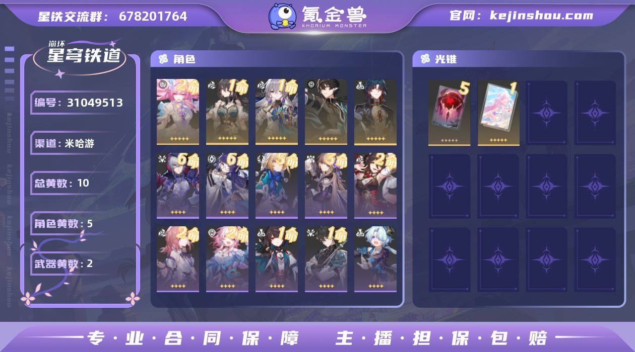 开拓等级:38 开拓者性别:男 总黄数:10 星轨专票:0 五星角色数:5 2命昔涟,1命阮·梅,1命布洛妮娅,0命丹恒·腾荒,0命刃 五星光锥数:2 5精记一位星神的陨落,1精爱如此刻永恒 邮箱状态:未绑定 卖家说:昔涟有武器皮肤