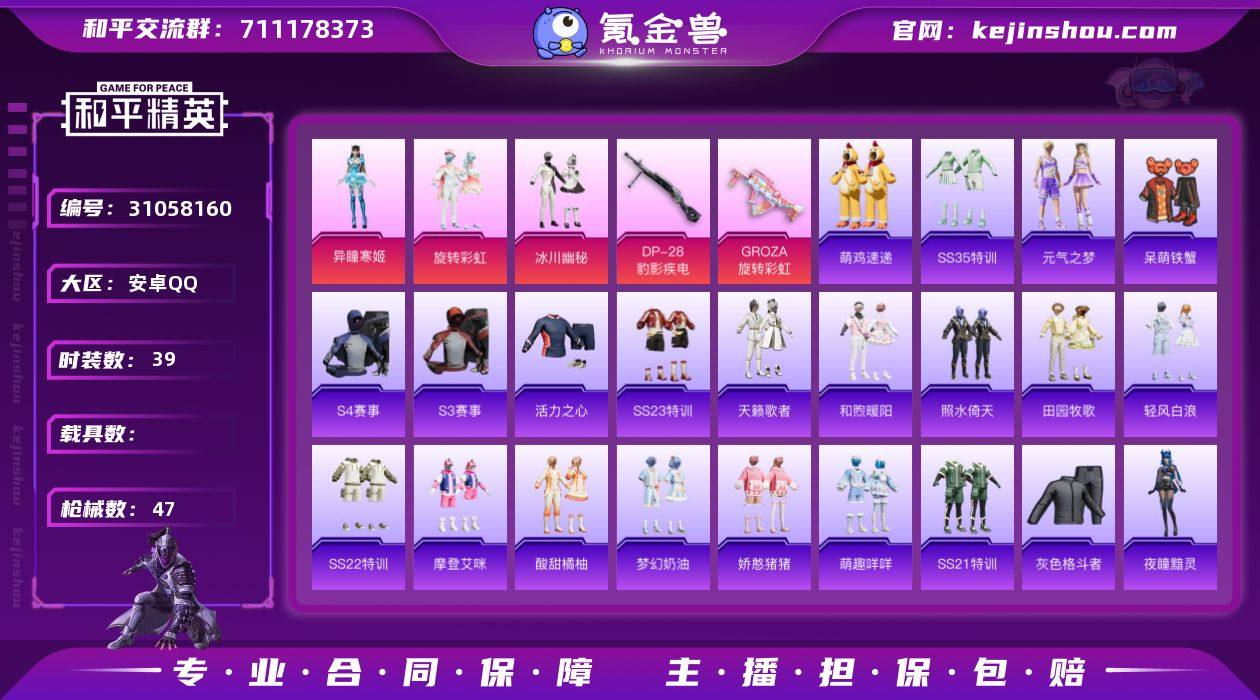 妹妹号 可改实名 3粉2特效枪39套47枪械 4级DP-28-豹影疾电 满级GROZA-旋转彩虹 异瞳寒姬 冰川幽秘 旋转彩虹 炫彩糖果 夜瞳黯灵 天籁歌者 呆萌铁蟹 小丑鱼 歌者冷鸢飞行器 炫彩糖果飞行器 王牌印记3 热力值16758 K27868 和平精英买号永久包赔带二次营地ID:326178340
