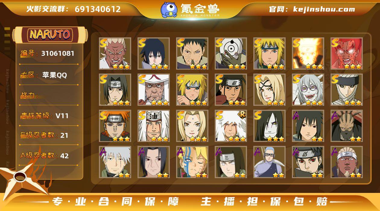 92312|【可实名】可二次 1100w战力 v10 苹果QQ 340区 S忍者数:26 A忍者数:44 时装19苹果QQ 340区 S忍者数:26 A忍者数:44 忍者:漩涡鸣人·宇智波佐助,旗木卡卡西「须佐能乎」,宇智波斑「秽土转生·解」,千手柱间「木叶创立」,宇智波佐助「永恒万花筒」,神秘面具男「红夜之刃」,春野樱「忍界大战」,漩涡鸣人「九喇嘛连结」,迈特凯「死门」,宇智波带土「忍界大战」,千手柱间「秽土转生」,宇智波鼬「秽土转生」,自来也「舞之豪杰」,药师兜「仙人模式」,宇智波斑「秽土转生」,宇智波斑「白面具」,千手扉间「秽土转生」,纲手「百豪」,波风水门「秽土转生」,猿飞日斩「秽土转生」,宇智波鼬「须佐能乎」,佩恩「天道」,波风水门,大蛇丸,纲手,自来也,迈特凯「青春爆炸」,巳月「仙人模式」,宇智波佐助「侠隐江湖」,宇智波泉奈,蝎「绯流琥」,李洛克「忍界大战」,宇智波鼬「夏日限定」,漩涡博人「桃式显现」,日向宁次「忍界大战」,长十郎「六代目水影」,长门「青年」,艾「青年」,达鲁伊「五代目雷影」,波风水门「青年」,奇拉比「忍界大战」,黑土「四代目土影」,宇智波佐助「须佐能乎」,加藤断,桃地再不斩「漂泊武士」,迪达拉「秽土转生」,猿飞木叶丸「木叶上忍」,漩涡鸣人「九尾查克拉」,千代「近松十人卫」,药师兜「半蛇斗篷」,地陆,我爱罗「忍界大战」,秋道丁次「忍界大战」,大蛇丸「晓」,猿飞阿斯玛「秽土转生」,春野樱「百豪」,照美冥「五代目水影」,宇智波佐助「万花筒写轮眼」,志村团藏,奇拉比,漩涡鸣人「仙人模式」,飞段「死司凭血」,宇智波止水,飞段,我爱罗「疾风传」,蝎,干柿鬼鲛,宇智波鼬,猿飞阿斯玛,迈特凯,佩恩「畜生道」,日向花火「武当宗师」,佩恩「地狱道」,佐井「最终章」,御手洗红豆「新春限定」,佩恩「饿鬼道」,犬塚花,佩恩「人间道」,君麻吕「漂泊浪客」,枫「新佩恩六道」,萨姆伊「新春限定」,鬼灯满月「忍刀...