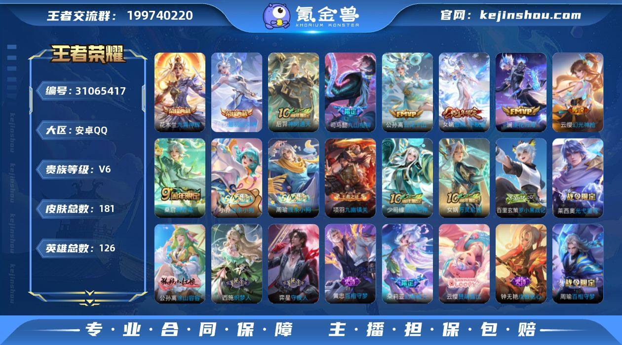 贵族等级:V6 典藏皮肤数:2 珍品无双皮肤数:0 无双皮肤数:0 珍品传说皮肤数:0 传说皮肤数:7 史诗皮肤数:59 皮肤数:181 英雄数:126 段位:星耀