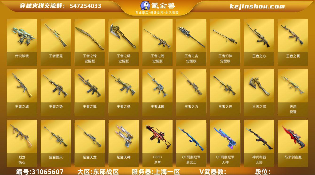 上海一区-83V-4王者武器数-2炫金武器数 【传说武器】:传说夜影 【热门武器】:传说夜影,G36C-幻影,QBZ03-金色蔷薇,M200-幻神,M200-竞技荣光,Kar98K-星神,M4A1-黑骑士,汤姆逊-烈龙,加特林-炼狱,羊驼玩偶*3,裁决-雪莉杨,COP-白鲨,沙鹰-修罗*4,炽芒蝶刃-荣耀世冠白鲨2023 皮肤 【王者炫金武器】:王者之魄,王者之心,王者之怒,炫金天龙*2 【音效卡】:M4A1-黑骑士音效卡,Barrett-毁灭音效卡,AWM-裁决音效卡,Kar98K-星神音效卡 【皮肤】:M200-幻神-荣耀世冠白鲨,幻神-电流骇客 皮肤,金色蔷薇-量子蔷薇 皮肤,裁决-羽掣 皮肤,裁决-星际旅行 皮肤,雷神-星空,雷神-源计划2.0专属 皮肤,毁灭-荣耀之怒,毁灭-星空,毁灭-虹光风暴 皮肤,黑骑士-破浪10年皮肤,黑骑士-破界 皮肤,天龙-能量核心,AWM-天龙-传奇白鲨,屠龙-荣耀之锋,屠龙-破浪逐光 皮肤,炽芒蝶刃-荣耀世冠白鲨2023 皮肤 【角色】:葵,电竞教官-云悠悠,隼,星际战将,幻面灵狐,电竞少女,芳心审判者,风暴女,虎妞,0号玩家,蛇姬,蜀雪,兔囡囡,维纳斯,新娜塔莎,游珑儿,智影 【人偶武器】:COP-白鲨,裁决-雪莉杨,火麒麟-灵狐 【挑战大师】:AK47-冰龙粉碎者 【英雄级武器】:AK47-火麒麟,M4A1-雷神*2,M4A1-黑骑士,AK12-天启,M4A1-武圣,G36C-幻影,黑武士-锦绣游龙,FAMAS G2-天戎,QBZ03-金色蔷薇,M4A1-猎神,王者之幻-觉醒版,HK417-朱雀-电竞之星,AWM-天龙,Barrett-毁灭*2,AWM-裁决,M200-幻神,Kar98K-星神,M200-竞技荣光,加特林-炼狱,汤姆逊-烈龙,沙鹰-修罗*4,沙鹰-天神,柯尔特-竞技荣光*2,Glock18-武圣,屠龙*4,龙啸*2,擎天,擎天-竞技荣光,高爆手雷-竞技荣光*11,高爆手雷-神工天巧,闪光弹-竞技荣光*10,闪光弹-神工天巧,烟雾弹-竞技荣光*9,烟雾弹-神工天巧 【道具】:BS战队炫彩背包