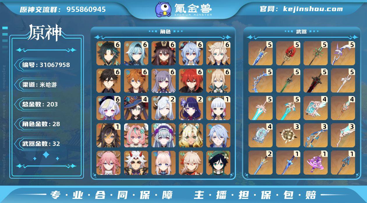 58级/203黄/女主/28个五星角色/32个五星武器 1命迪希雅,0命提纳里,0命神里绫人,0命八重神子,2命申鹤,0命荒泷一斗,满命优菈,2命雷电将军,0命枫原万叶,1命神里绫华,满命钟离,满命胡桃,满命甘雨,满命魈,0命温迪,满命达达利亚,满命阿贝多,0命珊瑚宫心海,满命刻晴,满命七七,满命琴,4命莫娜,满命迪卢克,0命希诺宁,0命梦见月瑞希,0命瓦雷莎,满命菈乌玛,0命杜林,精1波乱月白经津,精1神乐之真意,精1息灾,精1赤角石溃杵,精3终末嗟叹之诗,精5冬极白星,精1不灭月华,精1薙草之稻光,精1雾切之回光,精2苍古自由之誓,精5松籁响起之时,精5护摩之杖,精5磐岩结绿,精4四风原典,精5和璞鸢,精4天空之脊,精1贯虹之槊,精3天空之翼,精5阿莫斯之弓,精5天空之刃,精4天空之卷,精3尘世之锁,精5风鹰剑,精5狼的末路,精5天空之傲,精1纺夜天镜