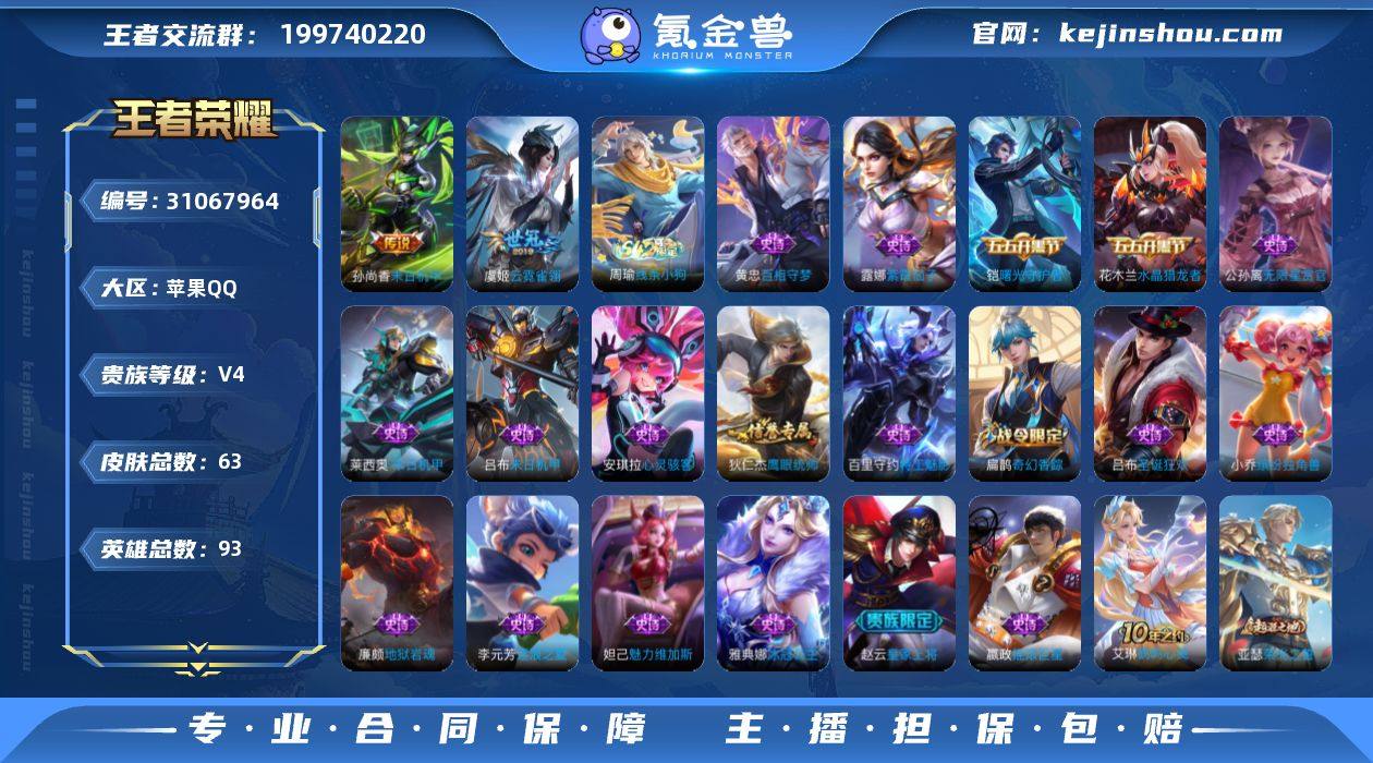 苹果QQ/V4/永恒钻石/63皮肤/91英雄/0典藏/0珍品无双/0无双/0珍品传说/2传说/19史诗/6稀有英雄 【1 小国标】小国标孙尚香, 【2 传说皮肤】云霓雀翎 虞姬,末日机甲 孙尚香, 【19 史诗皮肤】末日机甲 吕布,紫霞仙子 露娜,百相守梦 黄忠,无限星赏官 公孙离,摇滚巨星 嬴政,魅力维加斯 妲己,鹰眼统帅 狄仁杰,末日机甲 莱西奥,特工魅影 百里守约,逐浪之夏 李元芳,奇幻香踪 扁鹊,皇家上将 赵云,冰冠公主 雅典娜,水晶猎龙者 花木兰,圣诞狂欢 吕布,地狱岩魂 廉颇,曙光守护者 铠,心灵骇客 安琪拉,缤纷独角兽 小乔, 【26 勇者皮肤】拳王 达摩,海盐诗旅 桑启,白色死神 白起,阴阳师 狄仁杰,古海寻踪 张良,鲨炮海盗猫 沈梦溪,海滩派对 项羽,克喵 鬼谷子,踏浪烽翎 莱西奥,西部游侠 莱西奥,天穹祈灯 鬼谷子,潮玩骑兵 杨戬,死亡骑士 亚瑟,敏锐之力 李白,万事如意 刘备,擒涛扼浪 裴擒虎,探海日志 鲁班大师,兔女郎 花木兰,未来纪元 宫本武藏,荣光之誓 亚瑟,花好人间 甄姬,街头霸王 韩信,西部大镖客 孙悟空,特工战影 狂铁,劲辣红锅 太乙真人,鹤鸣心笺 艾琳, 【16 其他皮肤】金属狂潮 高渐离,战争骑士 夏侯惇,棒球奇才 沈梦溪,帝国元帅 项羽,启蛰 司空震,花间舞 公孙离,剑舞者 花木兰,归虚梦演 蒙犽,激情绿茵 马可波罗,埃及法老 杨戬,画中游 桑启,绝影神枪 百里守约,孤猎 澜,赤焰之缨 云缨,露花倒影 嫦娥,西部大镖客 孙悟空, 【6 稀有英雄】不知火舞,橘右京,娜可露露,韩信,艾琳,赵云, 营地ID: