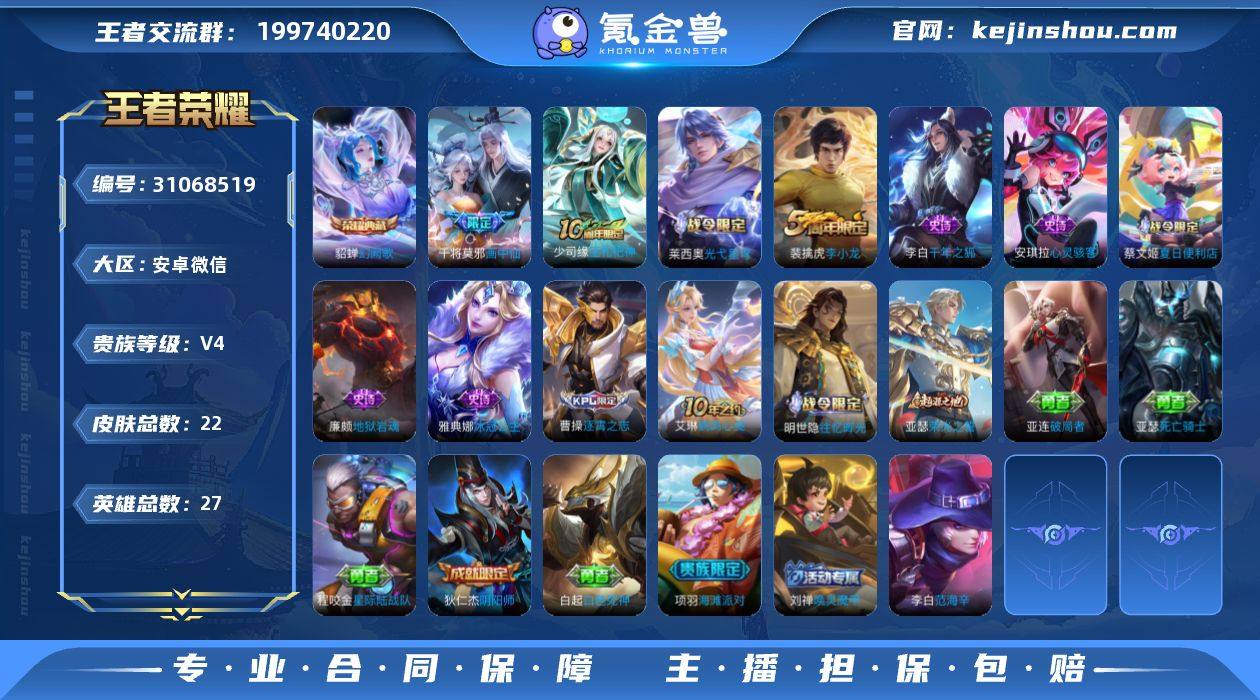 安卓微信 可二次 1典藏1传说27英雄22皮肤 幻阙歌 画中仙 巫礼祀神 逐霄之志 冰冠公主 李小龙 地狱岩魂 千年之狐 心灵骇客 夏日便利店蔡文姬 王者荣耀账号