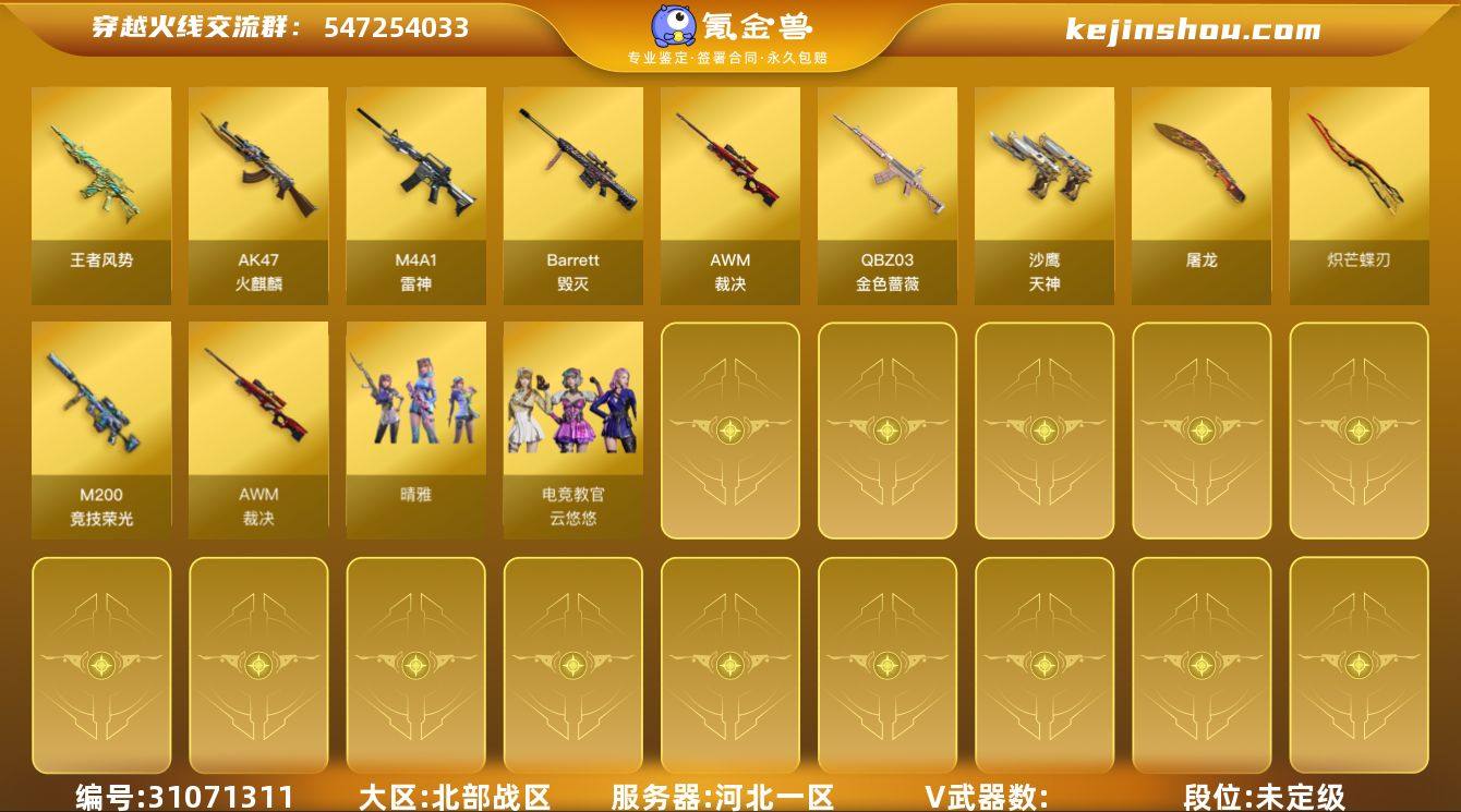 ABC11027/北部/河北一区/钱包注销/可排位/可二次/掌火ID:339591547/21V/M200竞技荣光/王者幻神/裁决/炽芒蝶刃/QBZ金色蔷薇/金色蔷薇拉丝/毁灭/火麒麟/火麒麟拉丝/雷神/【四防未开】/电竞教官云悠悠/晴雅/永久AC/细节看图