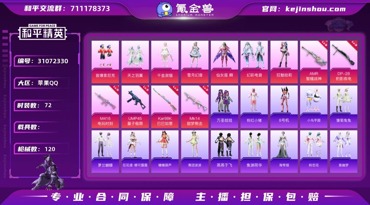 苹果手Q H-UWF112 满级天赋地铁【7粉装6特效枪 天之羽翼/音爆索尼克/千金淑猫/雪月幻音/仙女座瞬/幻彩电音/狂魅哈莉/粉红小猪/8号机/娜可露露/海琴烟/乐音/听雨铃兰】37107热力值4王牌印记72套装120枪皮 【热门品类】:粉装-音爆索尼克,套装-粉红小猪,角色-8号机 【粉色套装】:粉装-天之羽翼,粉装-音爆索尼克,角色-千金淑猫,粉装-雪月幻音,角色-仙女座 瞬,粉装-幻彩电音,角色-狂魅哈莉 【粉色枪皮等级】:M416-电玩时刻(五级),UMP45-量子极限(五级),Kar98K-