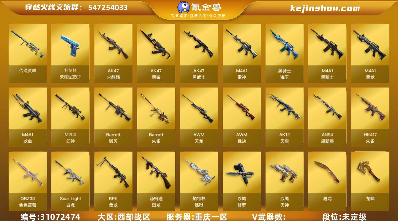 实名:可二次实名 VIP等级:VIP3 V武器数:58 王者武器数:6 CF点:12422 AK47-竞魂无影,AN94-竞魂超新星,Colt1911-量子风暴,Colt1911-胜者为王,COP-狼王,EVOⅢ-萌杀,EVOⅢ-序章,G36C-序章,魂·裁决-胜者为王,HK417-朱雀-电竞之星,金色蔷薇-狼王,军用铁锹-神秘明珠,灵・9A91-烈火-炫光,灵·炫光-龙啸,M200-玄龙,M4A1-狼王,M4A1-水晶,M4A1-再燃火线,神圣爆裂者-末日III,萨维奇-热血派对,屠龙-电竞之星,回声刃-荣耀之巅,USP-冥王,机械迷城-穹宇,死神-雪域霜狐,COP 357-雪域霜狐,M4A1-赤狱骑士,AWM-昌龙,QBZ191-银翼,AK47-B-身先士卒,USP-小动物,COP-堕天神,麒麟刺-堕天神,龙啸-堕天神,AK47-火麒麟,AK47-无影,AK47-黑鲨,AK47-黑武士,M4A1-雷神,M4A1-黑骑士,M4A1-龙血,白虎-电玩蓝兔,M200-幻神,Barrett-毁灭,Kar98k-星神,AA-12-雷霆,QBZ03-金色蔷薇,屠龙,龙啸,麒麟刺,擎天,炽芒蝶刃,M200-竞技荣光,柯尔特-竞技荣光,USP-雷暴,擎天-竞技荣光,AK47-B-常胜将军,Barrett-暗月传说,幻灵之锋,AK47-B-战士,AK-47-猩红传说,裁决,天神,G36C-幻影,M4A1-苍鸣雷神,Barrett-碧霄极光 王者冰锋,王者玄武,王者之啸-觉醒版,雷霆王者之锋-觉醒版,AK47-雷暴王者,王者雷怒 HK417-朱雀-电竞之星-竞星跃动音效卡,M4A1-赤狱骑士-怀旧音效卡,屠龙-电竞之星-竞星跃动音效卡,死神-雪域霜狐-怀旧音效卡,Barrett-毁灭-怀旧音效卡,M200-幻神音效卡,AWM-裁决音效卡,M4A1-黑骑士音效卡,M4A1-雷神音效卡 炫金黑龙,炫金超新星 迷你白狐,加特林-机械猎手,裁决-雪莉杨,巴雷特-零-水下丽影 卖家说:女帝幻神3皮带卡裁决三件套 星神幻影蓝兔 6副手 金名