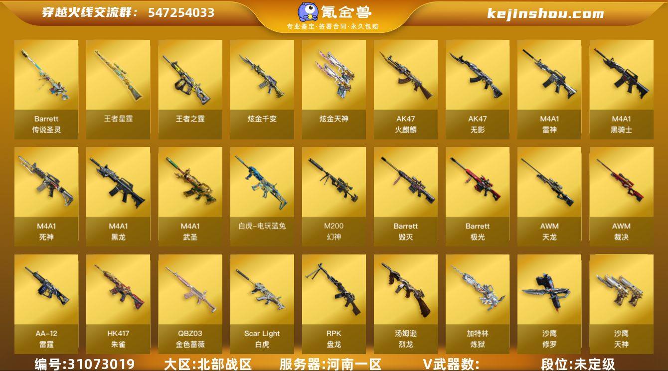 山东一区-123V-22王者-4炫金 【传说武器】:传说梦魇 【传说角色】:传说女帝 【热门武器】:传说梦魇,QBZ03-金色蔷薇,M14EBR-玄武,HK417-朱雀,M4A1-青龙,M200-幻神*5,荣耀世冠-雷神,白虎-电玩蓝兔,柯尔特-冠军之特*3,荣耀世冠-柯尔特*2,Kar98K-星神,M4A1-黑骑士*4,汤姆逊-烈龙*4,RPK-盘龙*5,加特林-炼狱,斯泰尔-蝴蝶,火麒麟-绝迹,COP-白鲨,USP-雷暴,COP-堕天神,沙鹰-修罗*2,Knife-冠军之刃*4,黄金猫猫手套-白鲨 【王者炫金武器】:炫金火麒麟,炫金毁灭,炫金天龙,炫金修罗 【音效卡】:M200-幻神音效卡,M4A1-雷神音效卡,M4A1-黑骑士音效卡,Barrett-毁灭音效卡 【皮肤】:M200-幻神-黄忠皮肤,幻神-冠军之幻,幻神-丹凤,幻神-宠儿-2021MVP,幻神-巅峰荣耀,幻神-CFS2022,白虎-AG-CFPLS20冠军,QBZ03-冠军之薇,金色蔷薇-枪娘阿敏 皮肤,裁决-叶芒苍灵 皮肤,雷神-荣耀之魄,雷神-星空,M4A1-雷神-CFS 2019,雷神-耀金皮肤,雷神-冠军之魄,雷神-传奇N9,M4A1-战神赵云,雷神-宠儿-2019MVP,雷神-R.LGD-CFPLS18冠军,雷神-荣耀世冠AG,雷神-宇航兔皮肤,雷神-CFS十周年纪念版 皮肤,火麒麟-冠军之心*2,AK47-火麒麟-传奇EVEN,火麒麟-轻羽皮肤,火麒麟-战神关羽,火麒麟-心动糖果,毁灭-暗月,毁灭-荣耀之怒*2,毁灭-冠军之怒,毁灭-CFS2020,毁灭-战神张飞,毁灭-BEAN-2020MVP,毁灭-黑大圣皮肤,M4A1-千变-孔明皮肤,黑龙-能量核心,黑龙-冠军之武,黑骑士-暗月,黑骑士-冠军之势,黑骑士-地狱火,黑骑士-战神马超,无影耀金皮肤,死神-秘银,战神-流金岁月皮肤,AK47-B-常胜将军-孙权,AWM-天龙-传奇白鲨,极光-能量核心,修罗-能量核心,修罗-冠军之魂,屠龙-荣耀之锋*2,屠龙-荣耀世冠AG*2,龙啸-冠军之啸*2,擎天-秘银,擎天-冠军之击*2 【角色】:葵,樱,魅影,雨棠,电竞教...