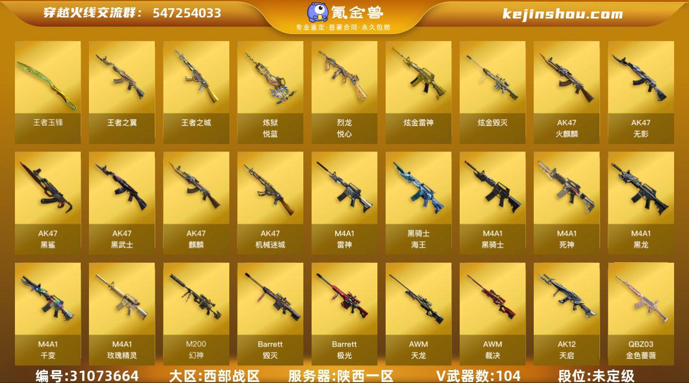 9647/西部/陕西一区/可排位/【荣耀枪王75豆】【Lv.102 荣耀元帅】VIP6/104V/幻神/幻神电竞之星/幻神丹凤/幻神降龙/幻神动感闪耀音效卡/青龙/QBZ金色蔷薇/*2/QBZ荣耀世冠EP/金色蔷薇电竞之星/金色蔷薇古蛇迷踪/巴雷特金色蔷薇/6修罗/修罗古蛇迷踪/王者玉锋/王者之击/尼泊尔雷霆/龙啸烈火龙威/两套雷霆手雷/一套雷暴手雷/一套竞技荣光手雷/【皮肤音效卡】/毁灭虹光风暴/毁灭英雄计划/雷神烈虎/雷神化蛇/雷神源计划2.0专属/毁灭音效卡/黑骑士音效卡/烈龙云海游龙音效卡/死神雪域霜狐怀旧音效卡/天神动感闪耀音效卡/【1个四防角色】/王者葵貂蝉/【其他角色】/隼/王者凌霄/荆棘玫瑰/灵狐者黄金海岸/葵/零/零纪元/战地猎狐/葵阿尔法武装/奇洋探员/乔伊教练/蛇隐宗/王者之瞳/修道士/雪域霜狐/云海玲珑/【玩偶武器】/朱雀蛇隐宗/雷神精英刀锋/火麒麟灵狐/天龙曼陀罗/牛牛AK47///各种道具、饰品/细节看图/【账号未封禁过十年】/