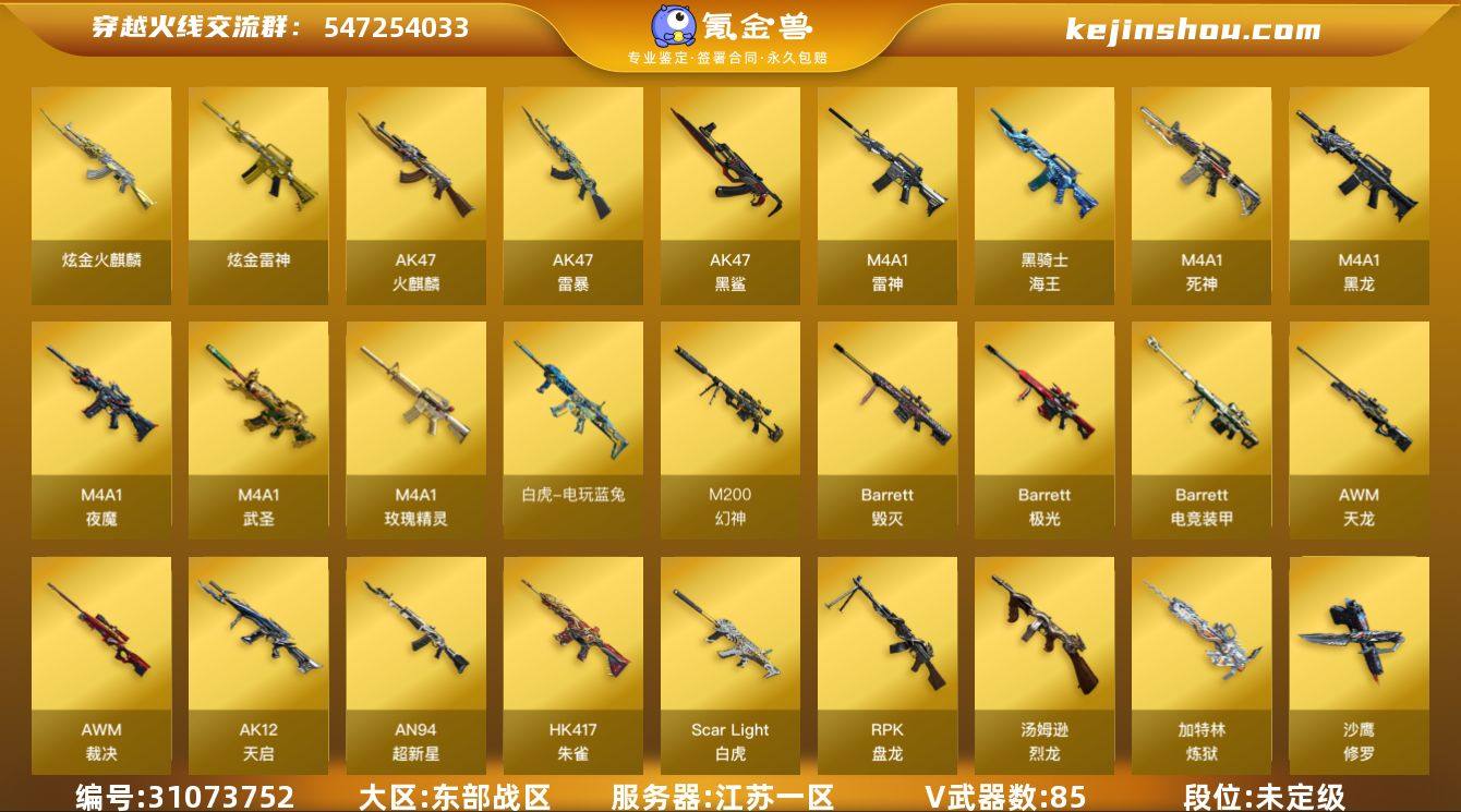 广西一区-37V-1王者-0炫金 【热门武器】:QBZ03-金色蔷薇,Scar Light-白虎,修罗-古蛇迷踪,M200-竞技荣光,死亡之眼,Kar98K-星神,M4A1-黑骑士,羊驼玩偶*2,雷神-小红,沙鹰-修罗*3 【音效卡】:Kar98K-星神音效卡,死神-雪域霜狐-怀旧音效卡,AK47-火麒麟-怀旧音效卡 【皮肤】:火麒麟-平天大圣 【角色】:战地猎狐,雪域霜狐,蛇隐宗,奇洋探员,乔伊教练,飞虎队-X,疾风,娟娟,龙儿,麻雀,娜塔莉娅,蛇姬,斯沃特-X,铁骑荣耀,雪莉杨-摸金校尉,游珑儿 【人偶武器】:雷神-小红,迷你牛牛,灵狐娃娃手雷 【暴走生化】:死亡之眼 【挑战大师】:冰龙粉碎者-白马银枪 【英雄级武器】:AK47-火麒麟,M4A1-雷神,M4A1-黑骑士,AK12-天启,AN94-超新星,Scar Light-白虎,黑武士-锦绣游龙,超新星-热带奇洋,死神-雪域霜狐,QBZ03-金色蔷薇,AWM-天龙,Barrett-毁灭,Kar98K-星神,M200-竞技荣光,沙鹰-修罗*3,沙鹰-天神*2,COP 357-云龙,COP 357-雪域霜狐,修罗-古蛇迷踪,屠龙*3,麒麟刺,龙啸-热带奇洋,高爆手雷-雷暴,高爆手雷-云龙*3,手雷-热带奇洋,高爆手雷-古蛇迷踪,闪光弹-雷暴,闪光弹-云龙*3,烟雾弹-云龙*3,烟雾弹-古蛇迷踪,M4A1-赤狱骑士 【道具】:云山科技背包,古蛇迷踪炫彩背包,奇洋探员-海龟背包,炫彩背包,热带奇洋炫彩背包,超级背包,雪域霜狐炫彩背包,女皇终结者-魔龙之吻,救世主-黑桃战神,绿色巨人,灵魂忍者*2,变异宝贝,迷雾幽灵*2,夺命之镰,防化服*3,金色流光-枪王排位,星辰流光-枪王排位,流光-鎏金之域,流光-再燃火线,枪王排位28赛季金色流光,枪王排位29赛季金色流光,古蛇迷踪打击特效,雪域霜狐表情,蛇隐宗表情,热带奇洋表情,防弹头盔*3,防弹衣*3,C4工具钳*3,手雷包*3 【特殊枪械】:1白虎,1黑骑士