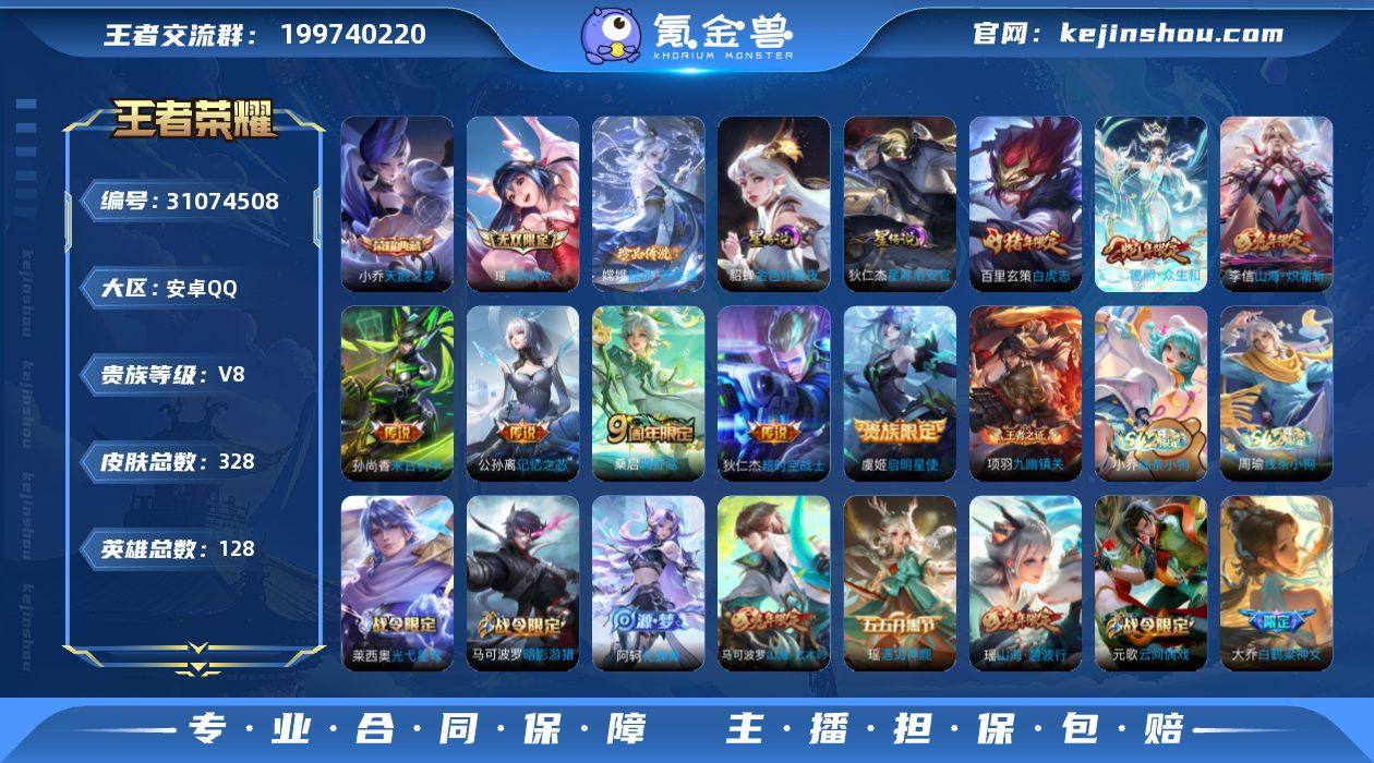 实名: 可修改 贵族等级: V8 英雄数: 128 皮肤数: 328 荣耀水晶: 天鹅之梦 无双皮: 真我赫兹(瑶) 珍品传说: 器灵·落星盏 星传说: 金色仲夏夜,星际治安官 传说皮: 末日机甲-孙尚香,超时空战士-狄仁杰,山海·炽霜斩,记忆之芯,启明星使 限定皮: 遇见飞天,李小龙,梁祝,白鹤梁神女,天狼溯光者,天狼运算者,白虎志,霸王别姬-虞姬,高山流水,五谷丰年,山海·玄木吟,山海·碧波行,鸣野蒿,陌上桑,逐霄战戟,愿照·众生和 亮点: 金标: 大乔 孙膑 瑶 明世隐 碗儿 炸弹猫 金禅