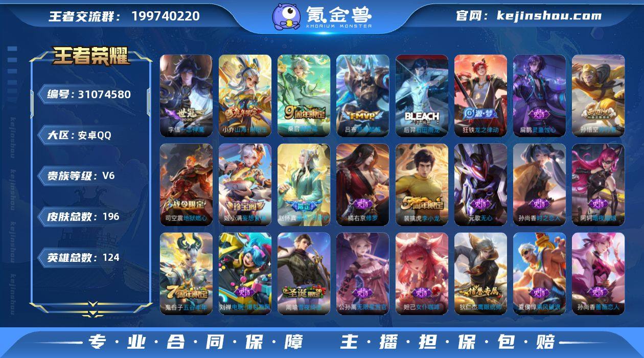 实名: 可修改 性别: 男号 贵族等级: V6 英雄数: 124 皮肤数: 196 传说皮: 一念神魔,山海·琳琅生 限定皮: 遇见飞天,李小龙,孙行者,五谷丰年,怒海麟威,鸣野蒿