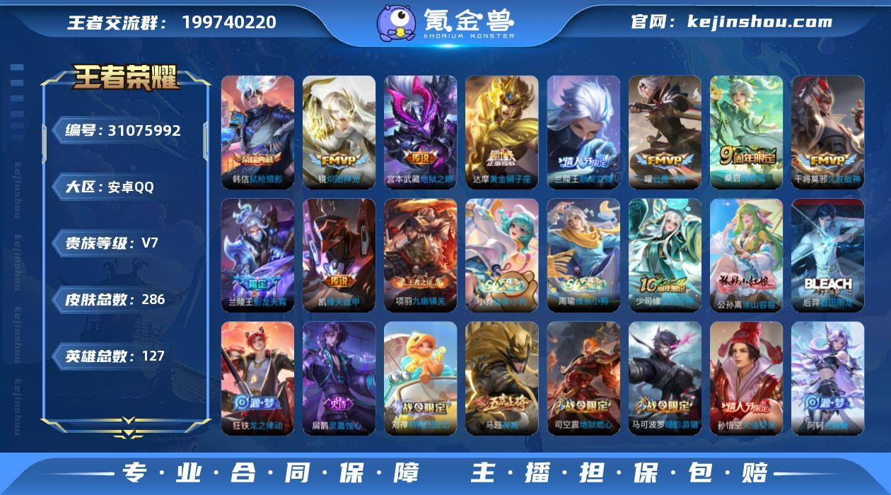 实名: 可修改 性别: 男号 贵族等级: V7 英雄数: 127 皮肤数: 286 荣耀水晶: 弑枪猎影 传说皮: 黄金狮子座,云鹰飞将,绛天战甲,久胜战神,炽阳神光,地狱之眼 限定皮: 李小龙,梁祝,天狼溯光者,神威,默契交锋-兰陵王,大圣娶亲,默契交锋-花木兰,高山流水,傲雪梅枪,五谷丰年,影龙天霄,鸣野蒿,逐霄战戟