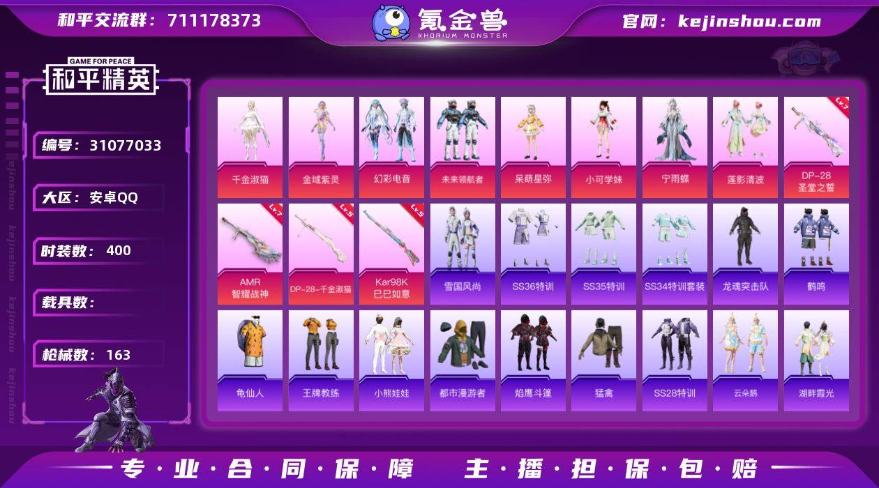 热力值:54028 时装数:400 枪械数:163 战备数:122 游戏等级:49 卓越印记:0 传奇印记:0 绝世印记:0 呆萌星弥,幻彩电音,金域紫灵,莲影清波,宁雨蝶,千金淑猫,未来领航者,小可学妹 七级AMR-智耀战神,七级DP-28-圣堂之誓,五级DP-28-千金淑猫,五级Kar98K-巳巳如意 极意拳锋飞行器,炫彩糖果降落伞,炫彩糖果飞行器,绝色倾城飞行器,彩虹甜喵降落伞,创世·救赎降落伞,幻彩电音降落伞,镜光幻境降落伞,金风玉露降落伞,江南烟雨降落伞,冷漠罗丽降落伞,洛神天依降落伞,魔法神域降落伞,拳皇·狂花道降落伞,千金淑猫降落伞,时光之吻降落伞,守护天翼降落伞,荧海星豚降落伞,宇宙意志降落伞,仲夏莫吉托降落伞,智耀战神降落伞 雪国风尚,SS36特训,炫彩糖果,SS35特训,SS34特训套装,缤纷果语,滨海厨神,冰河战士,白色伏地魔,春光漫游,彩虹兔,雏菊兔兔,长空猛禽,纯真浪花,顶瓜瓜,蝶变,大橘大利,都市丽猫,都市漫游者,电音精灵,粉恋花,龟仙人,鹤鸣,湖畔霞光,黑色伏地魔,黄色伏地魔,黄色运动,红色运动,幻世战舞者,幻羽潜行,惊鸿侠骨,娇憨猪猪,竞技名士,极速光影,街头风暴,锦衣飞扬,空岛之星,狂花道·雅典娜,快闪甜心,蓝冰羽,蓝彩潮人,龙的传人,灵公主,龙魂突击队,萝兰蝴蝶,蓝色运动,莱茵河畔,摩登魅猫,猛禽,棉花软糖,麻辣教官,懵萌河马,萌趣咩咩,冥星暗影,霓虹街区,柠萌假日,牛气满满,破蛋小黄鸡,破晓战魂,情公主,青团波波,青玉碎影,云朵鹅,热情海星,热血青春,日照花林,闪电轻猫,神气柴柴,SS17特训,SS20特训,SS21特训,SS22特训,SS23特训,SS24特训,SS25特训,SS26特训,SS27特训,SS28特训,SS29特训,SS30特训套装,SS31特训套装,SS32特训套装,SS33特训套装,石蕴玉辉,探宝勇士,涂山之恋,糖糖葫芦,特战装甲,王牌教练,雪绒豹,旭日情侣,香桃花海,星途旅人,小熊娃娃,玉兔迎春,焰鹰斗篷,鱼渊荷华,耀眼新星,燕燕于飞,智谋强哥,紫幽梦 MK12-乌木金纹,UMP45-极意拳锋,铝热弹-炫彩糖果,UZI-炫彩糖果,十字弩-异瞳寒姬,爆炸猎弓-喜羊羊与灰太狼,AA12-G-纯真浪花,AC-VAL-彩虹甜喵,AC-VAL-快闪甜心,AC-VAL-天降萌叽,AKM-环太平洋,AKM-龙的传人,AKM-棋盘冕主,AMR-白勺歌姬,AUG-天降萌叽,AUG-耀粉歌者,AWM-纯真浪花,AWM-焰鹰斗篷,爆炸猎弓-惊鸿侠骨,DBS-彩虹符号,DBS-幻彩电音,DBS-焰鹰斗篷,短管霰弹-圣域龙灵,大砍刀-云朵鹅,DP-28-彩虹符号,DP-28-焰鹰斗篷,G36C-懵萌河马,GROZA-海盐豹豹,GROZA-懵萌河马,GROZA-守护天翼,GROZA-荧海星豚,Kar98K-红色方程式,M16A4-冰河战士,M16A4-幻世战舞者,M16A4-莲影清波,M16A4-千金淑猫,M200-惊鸿侠骨,M200-乌木金纹,M249-彩虹符号,M249-无面战甲,M24-幻彩电音,M416-红色方程式,M416-蓝色火焰,M416-摩登王国,M416-糯团青竹,M417-惊鸿侠骨,M762-彩虹符号,M762-雏菊兔兔,M762-云朵鹅,MG3-幻世战舞者,MG3-惊鸿侠骨,蜜獾-天降萌叽,蜜獾-娇憨猪猪,蜜獾-糖糖葫芦,Mini14-雏菊兔兔,Mini14-涂山之恋,Mini14-香桃花海,Mk14-冰河战士,Mk14-紫幽梦,MK20-H-星途旅人,MK20-H-快闪甜心,MK20-H-莲