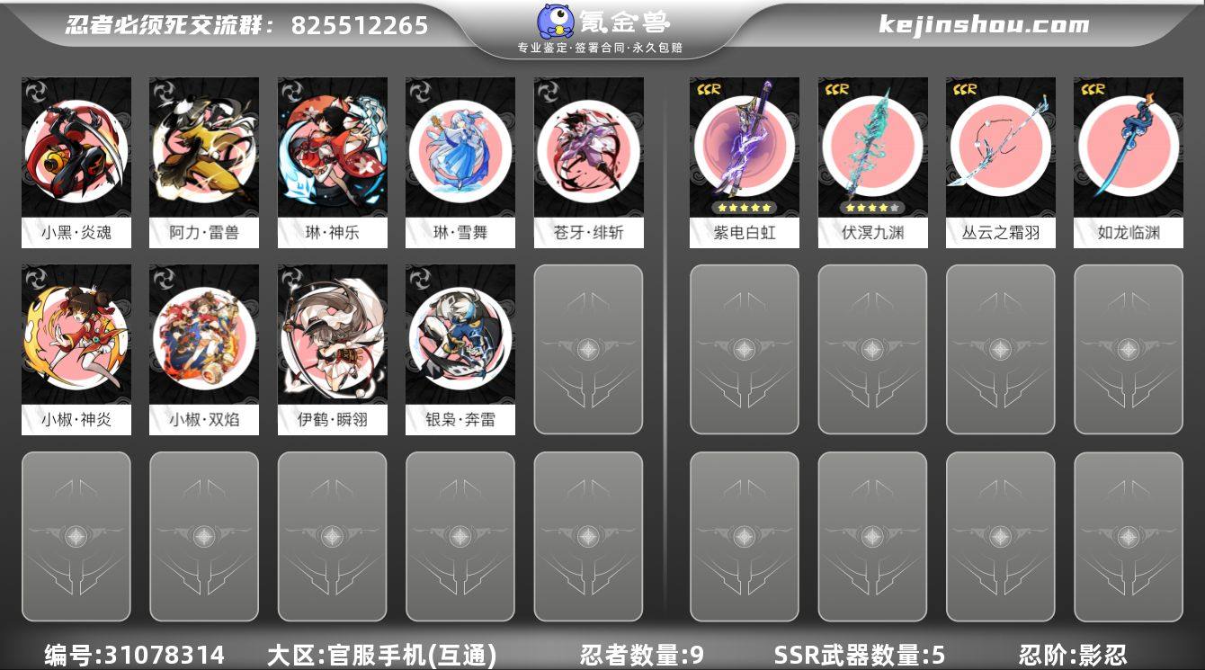 忍阶:影忍 忍者数量:9 零命阿力·雷兽,零命苍牙·绯斩,零命琳·神乐,零命琳·雪舞,二命小椒·双焰,零命小黑·炎魂,零命小椒·神炎,零命伊鹤·瞬翎,零命银枭·奔雷 SSR武器数量:5 五星紫电白虹,四星伏溟九渊,丛云之霜羽,如龙临渊
