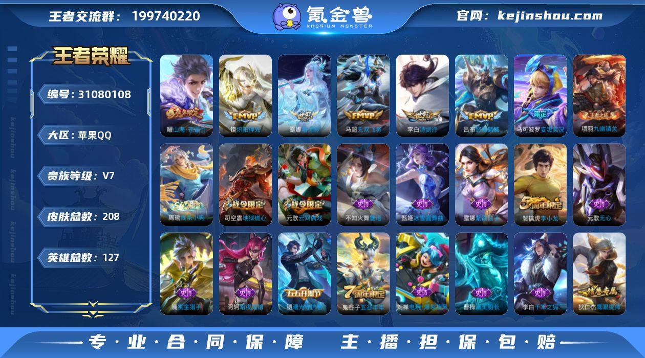 实名: 可修改 贵族等级: V7 英雄数: 127 皮肤数: 208 传说皮: 炽阳神光,无双飞将,山海·苍雷引,妄想实况,霜月吟 限定皮: 李小龙,游园惊梦,梁祝,五谷丰年,诗剑行,怒海麟威