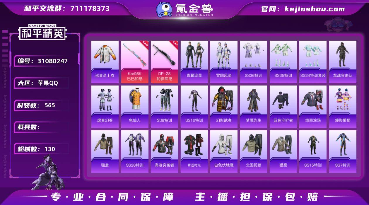 热力值:40396 时装数:565 枪械数:130 战备数:105 游戏等级:69 卓越印记:0 传奇印记:0 绝世印记:0 四级Kar98K-巳巳如意,一级DP-28-豹影疾电 春暖花开降落伞 青翼流星,雪国风尚,SS36特训,巡查员衣服,SS35特训,SS34特训套装,暗黑骑手,冰川格斗者,冰川特警,缤纷果语,北国孤狼,滨海假日,爆裂葡萄,白色伏地魔,白熊同盟,长空猛禽,春日漫步,呆萌铁蟹,都市魅力,电音精灵,粉红小猪,疯狂小兔子,福星高照,飞行日记,格斗先锋,龟仙人,贵族骑装,海滨突袭者,海岛探路者,湖蓝色名流,黑色伏地魔,黄色伏地魔,黄色名流,海上生明月,黄色运动,红色运动,幻世战舞者,幻影武者,极地朋克,酒红色名流,橘黑制服,娇憨猪猪,竞技达人朋克,竞技名士,竞技勇士朋克,吉莉礼服,坚韧舞者,极速红龙,金鼠迎春,街头潮人,军械专家,空岛之星,空投萌叽,蓝彩潮人,蓝调潮人,龙魂突击队,猎鹰,猎梦纪元,蓝色守护者,蓝色运动,龙腾端午,冷焰舞者,猛禽,萌黄之夏,魅力单车,萌趣咩咩,萌趣颜团子,梦魇先生,霓虹极客,霓虹街区,怒火燎原,牛气冲天,牛气满满,破蛋小黄鸡,破晓战魂,绮丽涂鸦,青年教官,青涩时光,瑞龙福将,人气偶像,热血青春,深蓝色名流,SS10特训,SS11特训,SS12特训,SS13特训,SS14特训,SS15特训,SS16特训,SS17特训,SS18特训,SS19特训,SS20特训,SS21特训,SS22特训,SS23特训,SS27特训,SS28特训,SS2特训,SS32特训套装,SS33特训套装,SS3特训,SS4特训,SS5特训,SS6特训,SS7特训,SS8特训,SS9特训,探宝勇士,甜蜜告白,甜蜜熊情侣,特训学院,甜心亚梦,团圆交子,特种颜团子,完美偶像,炫蓝之夏,夏日音浪,雪山精英,虚音幻奏,异彩先驱,跃动心情,耀粉歌者,阳光火鸡,玉兔迎春,野性战心,英勇保护者,夜莺强袭者,战地督导,战地菁英,灼焰舞者 ACE32-冰晶雪宝,MK12-乌木金纹,铝热弹-炫彩糖果,撬棍-冰晶雪宝,M249-冰晶雪宝,MG-36-薄荷星砂,P90-玩趣呆呆,AC-VAL-彩虹甜喵,AC-VAL-甜心亚梦,AKM-彩虹符号,AKM-虎虎生威,AKM-龙的传人,AKM-萌趣颜团子,AKM-霓虹街区,AKM-破晓战魂,AKM-生命誓言,AKM-夜灯,AUG-耀粉歌者,DBS-甜心亚梦,DP-28-彩虹符号,DP-28-甜心亚梦,GROZA-生命誓言,GROZA-异彩先驱,Kar98K-彩虹符号,Kar98K-红色方程式,Kar98K-王子的夏天,Kar98K-炫彩节奏,M16A4-红色方程式,M16A4-幻世战舞者,M16A4-蓝色火焰,M16A4-生命誓言,M16A4-甜心亚梦,M249-破晓战魂,M249-无面战甲,M24-炫彩节奏,M416-红色方程式,M416-蓝色火焰,M762-牛气冲天,M762-瑞龙福将,M762-生命誓言,M762-天降萌叽,MG3-幻世战舞者,MG3-瑞龙福将,蜜獾-娇憨猪猪,Mini14-耀粉歌者,Mini14-穿刺龙虾,Mini14-金鼠迎春,Mini14-生命誓言,Mini14-异彩先驱,Mini14-千面幻镜,Mk14-冰河战士,MK20-H-狂鲨锋刃,MP5K-怪笑疯兔,MP5K-异彩先驱,平底锅-缤纷糖果,平底锅-娇憨猪猪,平底锅-瑞龙福将,平底锅-甜心亚梦,平底锅-异彩先驱,破片手榴弹-萌趣颜团子,撬棍-绯红前夜,S12K-垂柳戏鸭,S12K-幻世战舞者,S12K-娇憨猪猪,S12K-破晓战魂,S1