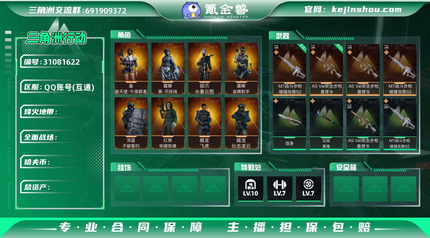 实名: 不可修改 干员外观: 威龙-壮志凌云(S3),骇爪-水墨云图,无名-夜鹰(S4),威龙-飞虎,蜂医-送葬人·无题密令(S5),露娜-黑·天际线,蛊-能天使·午夜邮差,深蓝-不破誓约(S6),红狼-电锯惊魂,露娜-金牌射手(S7) 传说武器皮肤: 近战-黑海,725双管霰弹枪-送葬人-无题密令,M4A1突击步枪-阿米娅,CAR-15突击步枪-阿米娅,腾龙突击步枪-捞点薯条,93R-捞点薯条,AK-12突击步枪-特斯拉线圈,SR-3M紧凑突击步枪-特斯拉线圈,UZI冲锋枪-特斯拉线圈,勇士冲锋枪-能天使-午夜邮差,M250通用机枪-骑士之心,M7战斗步枪-棱镜攻势S2(典藏),SCAR-H战斗步枪-启航,ASh-12战斗步枪-鹅鸭杀,QCQ171冲锋枪-鹅鸭杀,QJB201轻机枪-鹅鸭杀,G3战斗步枪-骑士,KC17突击步枪-电锯惊魂,AS Val突击步枪-悬赏令(典藏),近战-信条,P90冲锋枪-信条,SG552突击步枪-运动员