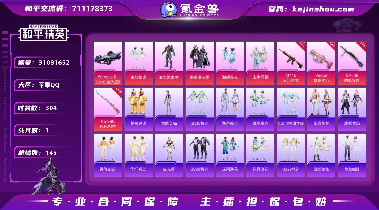热力值:57401,7粉装,6粉枪,18粉色战备,131套装,177枪械,231装备,3滑翔尾翼,71降落伞;等级:Lv.64 历史最高段位:绝世王牌21星 当前段位:坚韧.铂金Ⅱ;王牌印记7次 卓越印记3次 传奇印记3次 绝世印记3次; 【热门品类】:套装-浪漫天命,套装-龟仙人;【粉色套装】:粉装-数码大师,粉装-冰霜白皇,粉装-冰川幽秘,粉装-莲影清波,角色-烟云彩露,角色-异瞳寒姬,粉装-英伦信使;【粉色枪械】:M762-青锋波束[5级],AKM-绿萝繁花[5级],SCAR-L-童趣迷兔[7级],M416-电玩时刻[5级],DP-28-豹影疾电[5级],PKM-江南烟雨[7级];【粉色降落伞】:阿狸红降落伞,拳皇狂花道降落伞,相思残雪降落伞,炫彩糖果降落伞,林间仙鹿降落伞,未来歌姬降落伞,蜜语绒猫降落伞,王牌四分卫降落伞,莲影清波降落伞,甜蜜誓约降落伞,创世救赎降落伞,绯穹魔姬降落伞,暗夜鎏金降落伞,忍者神龟降落伞,闲梦青缨降落伞,江南烟雨降落伞,橘柚倾心降落伞,精灵梦叶罗丽降落伞;【其他套装】:套装-特训学院,套装-蓝色运动,套装-白色伏地魔,套装-黑色伏地魔,套装-竞技名士,套装-长空猛禽,套装-海岛探路者,套装-雨林探路者,套装-特殊使命,套装-活力之心,套装-完美偶像,套装-幻影武者,套装-街头潮人,套装-魅力单车,套装-竞技达人朋克,套装-都市漫游者,套装-野性战心,套装-破晓战魂,套装-都市魅力,套装-酷潮明星,套装-极地朋克,套装-冰凉西瓜,套装-血色贵族,套装-甜蜜熊情侣,套装-缤纷果语,套装-龙魂突击队,套装-灿烂千阳,套装-元素星魂,套装-格斗先锋,套装-麻辣教官,套装-破蛋小黄鸡,套装-疯狂小兔子,套装-军械专家,套装-云纹魔法士,套装-霓虹街区,套装-暗夜契约,套装-纯白誓言,套装-白熊同盟,套装-萌黄之夏,套装-牛气满满,套装-青春冒险家,套装-潮流游乐家,套装-萌趣颜团子,套装-特...