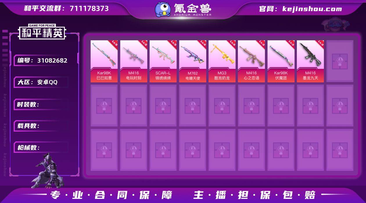 J2365 【精品女号】18粉 14特 1载 萌熊背包 金鞋 天网 深海小丑鱼 暗影哥特 浪漫波比 樱桃泡泡 绯穹魔姬 星之彼岸 智耀战神 老油条 鸢尾晶梦 赵灵儿 满级枪*6 安卓 手Q-18粉装-14特效枪-1载具-4粉色飞行器-95627热力值-18王牌印记-227套装-288枪皮 【热门品类】:粉装-梦幻火箭,套装-派对舞王,套装-深海小丑鱼,角色-军刀雅典娜,套装-天网终结者,套装-龟仙人,套装-暗影哥特,套装-浪漫波比,角色-Mark.06,熔岩游骑兵连帽夹克 【粉色套装】:粉装-幻影战神,粉装-蝶舞迷情,粉装-梦幻火箭,粉装-智能音符,粉装-星之彼岸,角色-洛天依,角色-复仇流浪者,女娲后裔-赵灵儿,粉装-寒光使者,粉装-挚爱序曲,角色-美雪,角色-美琪,角色-脉冲星,角色-鸢尾晶梦,粉装-金丰海韵,角色-樱桃泡泡,角色-智耀战神,角色-绯穹魔姬 【粉色枪皮等级】:SCAR-L-锦绣绵绵(五级),M416-风花雪月(七级),GROZA-巴啦啦小魔仙(五级),AUG-星之彼岸(七级),M762-鬼刀(五级),UMP45-萌骑冒险(二级),P90-金丰海韵(六级),Kar98K-巳巳如意(五级),Mk14-樱桃泡泡(五级),Mk14-福马献瑞(五级),SLR-暗夜玫瑰(五级),AMR-智耀战神(五级),DP-28-豹影疾电(五级),MG3-洛神天依(七级) 【粉色载具】:仰望U9(赤霞丹朱) 【粉色枪皮】:SCAR-L-锦绣绵绵,M416-风花雪月,GROZA-巴啦啦小魔仙,AUG-星之彼岸,M762-鬼刀,UMP45-萌骑冒险,P90-金丰海韵,Kar98K-巳巳如意,Mk14-樱桃泡泡,Mk14-福马献瑞,SLR-暗夜玫瑰,AMR-智耀战神,DP-28-豹影疾电,MG3-洛神天依 【粉色飞行器】:炫彩糖果飞行器,深渊漩涡飞行器,极意拳锋飞行器 【粉色降落伞】:绝对恒星降落伞,极限特训降落伞,幻影战神降落伞,星之彼岸降落伞,暗夜玫瑰降落伞,洛神天依降落伞,炙焰牛王降落伞,环太平洋降落伞,巴啦啦小魔仙降落伞,金丰海韵降落伞,宇宙意志...