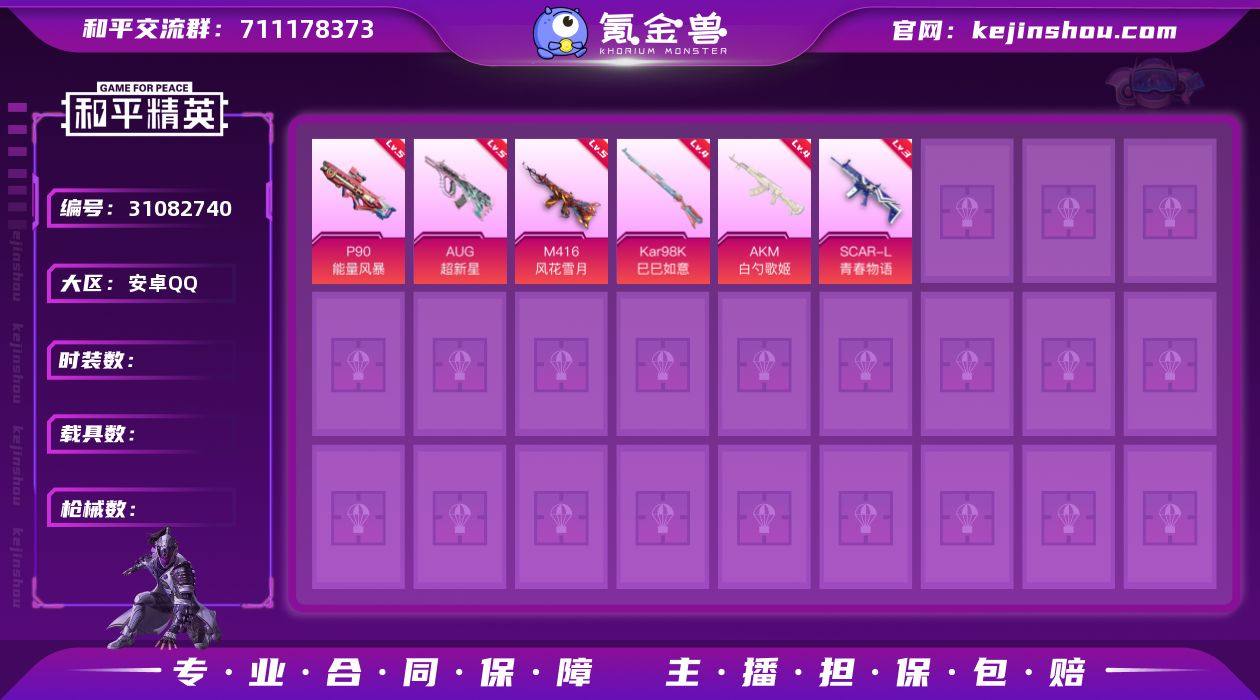 和平王者一体号 安卓 手Q-7粉装-7特效枪-1载具-3粉色飞行器-77813热力值-20王牌印记-204套装-234枪皮LK262321 【热门品类】:粉装-雪国幻梦,粉装-梦幻火箭,套装-浪漫天命,套装-深海小丑鱼,套装-小丑鱼,套装-动感兔斯基人偶服,套装-龟仙人,套装-暗影哥特 【粉色套装】:粉装-雪国幻梦,粉装-梦幻火箭,粉装-星之彼岸,粉装-齐天大圣,角色-初号机款机体服,粉装-筑梦精灵,粉装-仲夏莫吉托 【粉色枪皮等级】:AKM-梦之光华(六级),SCAR-L-青春物语(七级),M416-五爪金龙(六级),Kar98K-未来歌姬(二级),Kar98K-巳巳如意(五级),VSS-烈焰拳霸(三级),DP-28-豹影疾电(五级) 【粉色载具】:兰博基尼Estoque(银翼灰) 【粉色枪皮】:AKM-梦之光华,SCAR-L-青春物语,M416-五爪金龙,Kar98K-未来歌姬,Kar98K-巳巳如意,VSS-烈焰拳霸,DP-28-豹影疾电 【粉色飞行器】:青春物语飞行器,璀璨巨星飞行器,龙翔九天飞行器 【粉色降落伞】:未来战士降落伞,梦幻火箭降落伞,四圣焕新降落伞,星之彼岸降落伞,暗夜玫瑰降落伞,绚金瑰梦降落伞,庄周梦蝶降落伞,筑梦精灵降落伞,垂柳戏鸭降落伞,第五大道降落伞,天星战神降落伞,未来歌姬降落伞,精灵梦叶罗丽降落伞,鬼刀降落伞,炫彩糖果降落伞 【稀有套装】:套装-龟仙人,套装-巳巳如意,套装-雪国风尚,角色-多纳泰罗 【稀有枪皮】:AKM-彩虹符号,AKM-影袭,AKM-星之信仰,AKM-灼热熔岩,AKM-环太平洋,AKM-生命誓言,AKM-破晓战魂,AKM-缤纷海域,AKM-萌趣颜团子,AKM-虎虎生威,AKM-霓虹街区,AKM-龙的传人,M16A4-幻世战舞者,M16A4-快乐主宰,M16A4-甜心亚梦,M16A4-红色方程式,M16A4-蓝色火焰,SCAR-L-夜灯,SCAR-L-炫彩节奏,SCAR-L-玉兔迎春,SCAR-L-生命誓言,SCAR-L-红色方程式,SCAR-L-黄金龙骨,M416-夜灯,M416-糯团青竹,M416-紫翼圣骑,M416-...