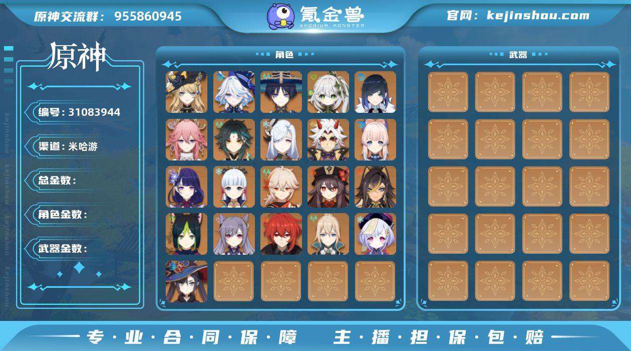 冒险等级:60 总黄数:52 5星角色数:26 5星武器数:15 原石数量:90 纠缠之源数量:6 4命莫娜,3命七七,2命迪卢克,1命优菈,1命迪希雅,0命玛薇卡,0命恰斯卡,0命娜维娅,0命芙宁娜,0命那维莱特,0命纳西妲,0命夜兰,0命八重神子,0命申鹤,0命荒泷一斗,0命珊瑚宫心海,0命雷电将军,0命神里绫华,0命枫原万叶,0命胡桃,0命甘雨,0命钟离,0命达达利亚,0命提纳里,0命刻晴,0命琴 6命班尼特,6命香菱,6命行秋,6命芭芭拉,6命北斗,6命迪奥娜,6命菲谢尔,6命雷泽,6命罗莎莉亚,6命诺艾尔,6命凝光,6命砂糖,6命托马,6命辛焱,6命烟绯,5命坎蒂丝,5命五郎,4命久岐忍,4命夏洛蒂,4命重云,4命柯莱,4命丽莎,4命早柚,3命琳妮特,3命多莉,3命云堇,2命嘉明,2命鹿野院平藏,2命米卡,2命瑶瑶,1命菲米尼,1命绮良良,1命珐露珊,1命凯亚,1命莱依拉,0命卡齐娜,0命欧洛伦,0命塔利雅,0命安柏,0命埃洛伊 精1星鹫赤羽,精1万世流涌大典,精1赤沙之杖,精1赤角石溃杵,精1薙草之稻光,精1飞雷之弦振,精1苍古自由之誓,精1松籁响起之时,精1风鹰剑,精1天空之傲,精1天空之卷,精1天空之刃,精1四风原典 100%侦察骑士,古恩希尔德的传承,帆影游风,极夜真梦,闪耀协奏,纱中幽兰,玄玉瑶芳,星与月之约,叶隐芳名,致教会自由人